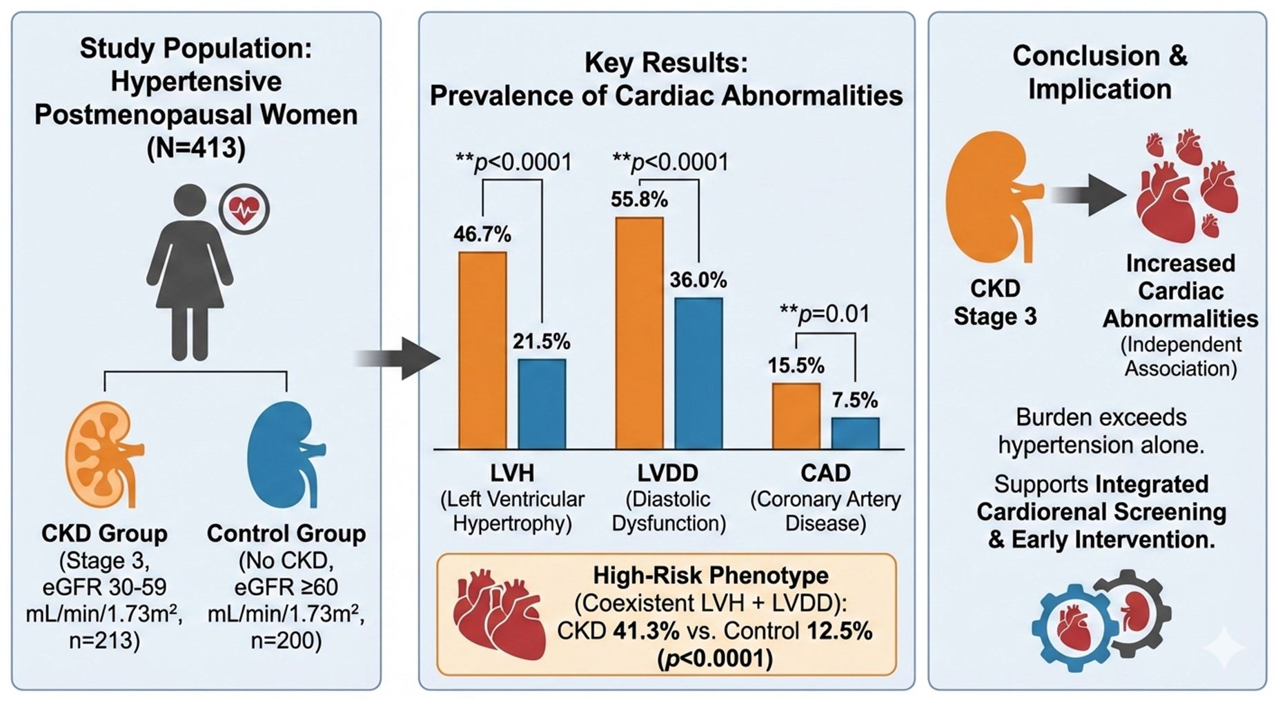 Beyond Blood Pressure: Cardiac Structural and Functional Abnormalities in Hypertensive Postmenopausal Women with Mild-to-Moderate Chronic Kidney Disease