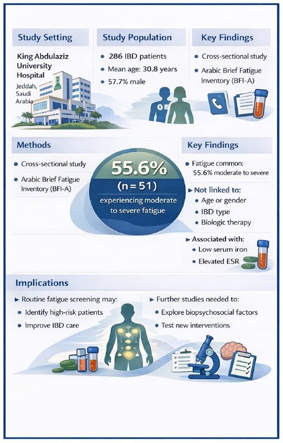 APA StyleMukhtar, M. S., Mosli, M., Butt, N., Bamousa, S. M., Alqarni, S. A., Mustafa, M., Bawazir, Y., & Alsolaimani, R. (2026). Prevalence of Fatigue Among Inflammatory Bowel Disease Patients at a Tertiary Center in Saudi Arabia. Journal of Clinical Medicine, 15(8), 2941. https://doi.org/10.3390/jcm15082941