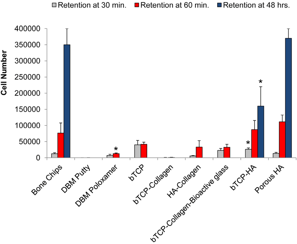 In an in vitro setting, cell retention was measured on 9 different commercially available carrier substrates at 30 and 60 min, and 48 h (Figure 1). A cell suspension was added to the substrate at a 1:2 volumetric ratio. The first observation was the dissolution of DBM and collagen-containing materials. DBM carriers are synthesized by the acidification of allograft bone with hydrochloric and/or citric acid to remove mineral, preserving a matrix of organic proteins, consisting primarily of primarily collagen fibrils [56,57,58]. Most collagen and collagen-composites are synthesized by the lyophilization (freeze-drying) or precipitation of a solubilized collagen derived from acidified bovine or porcine tissues [59,60]. For DBM and collagen substrates, the introduction of water, saline, blood, or other fluids hydrates the material, making it softer by dissolving a portion of the protein matrix. The hydration of dry collagen matrix can lead to physical constriction of the material, decreasing the average pore size and thereby limiting its accessibility to cells and blood vessels. As the proteins dissolve, the loss of available binding surface area may render the material ineffective as a scaffold to bridge a bony defect. The dissolution of DBM and collagen-containing carriers made evaluation of cell retention beyond early time points impossible. Two of the collagen-containing materials demonstrated cell retention at 30 min comparable to bone chips and the calcium phosphate materials. However, as the materials resorbed into the media, there was little or no physical material to collect for cell quantification. This study aimed to identify the number of cells resident on an implant material through 48 h to provide researchers and physicians insight into the fate of BMSCs. If the cell-bound portions of the materials are resorbed between 60 min and 48 h in vitro, there is likely some corollary to in vivo material resorption and potential cell loss (migration away from the implant site or death). The provision of a stable ECM is essential for sufficient retention of cells at the implant site [37]. The βTCP/HA and HA substrates maintained their mass and geometry in solution through the duration of the study and achieved increasing cell counts with time. The successful binding between cells and ceramic materials can be attributed initially to electrostatic interactions of membrane proteins with calcium and phosphate ions on the granules’ surface. The increased cell counts from 30 to 60 min are related to gradual binding of cells, however, the drastic gain in cell number at 48 h is undoubtedly due to cell proliferation on the substrates as an extracellular matrix is established on the surface of the material. Porous HA granules possess more than 7 m2 of surface area per gram, at least six-fold increase over typical calcium phosphate particulates. The increased surface area permitted greater cell proliferation and spreading, which demonstrated the highest cell counts at the later time point.