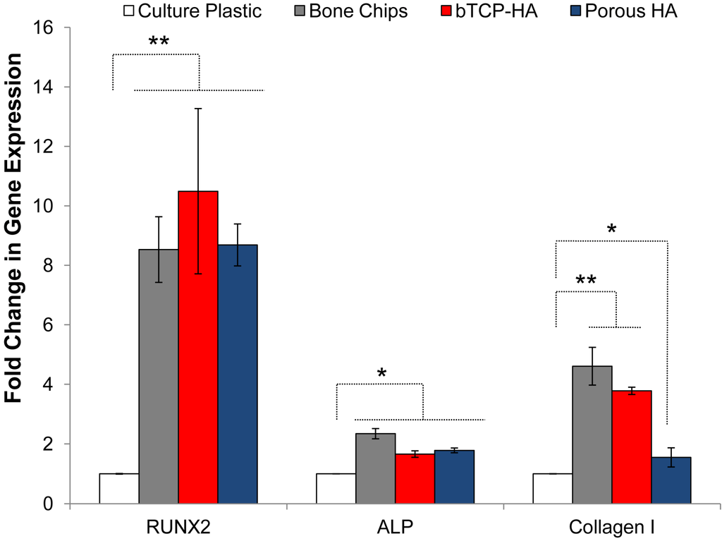 It is known that the biological, chemical, and physical properties of the graft materials directly influence the physiology of osteoblast progenitors. For example, nano-scale topological features such as porosity have influenced differentiation mechanisms of attached MSCs [65,66,67] and molecules on the surface may directly modulate receptors or achieve this indirectly through bound plasma proteins, growth factors, or other molecules. In the present study, we observed that BMSC adherence to bone chips, βTCP-HA, and porous HA increased Runx2 expression by 8.5, 10.5, and 8.7-fold when compared to tissue culture plastic monolayer controls. Runx2 is an early-stage transcription factor that activates osteoblastic differentiation [68] and is highly indicative of commitment to an osteoblastic lineage. This level of Runx2 up-regulation was unexpectedly high for a 48 h time point without dexamethasone or bone morphogenic administration supporting the critical role of the solid substratum in addition to biochemical stimulation. On the other hand, the expression of ALP was only moderately increased for these substrates (2.3, 1.7, and 1.8-fold, respectively) but this protein is usually upregulated by BMSCs after more than 48 h or osteogenic stimulation under standard conditions [55]. Bone chips triggered a greater up-regulation of type I collagen than either synthetic substrate (4.6-fold over culture plastic compared to 3.8-fold for βTCP-HA and 1.5-fold for porous HA). We hypothesize that this effect is partially due to existing collagen and ECM proteins within the bone chips and absent from the ceramic particles that may promote further ECM remodeling and synthesis.
