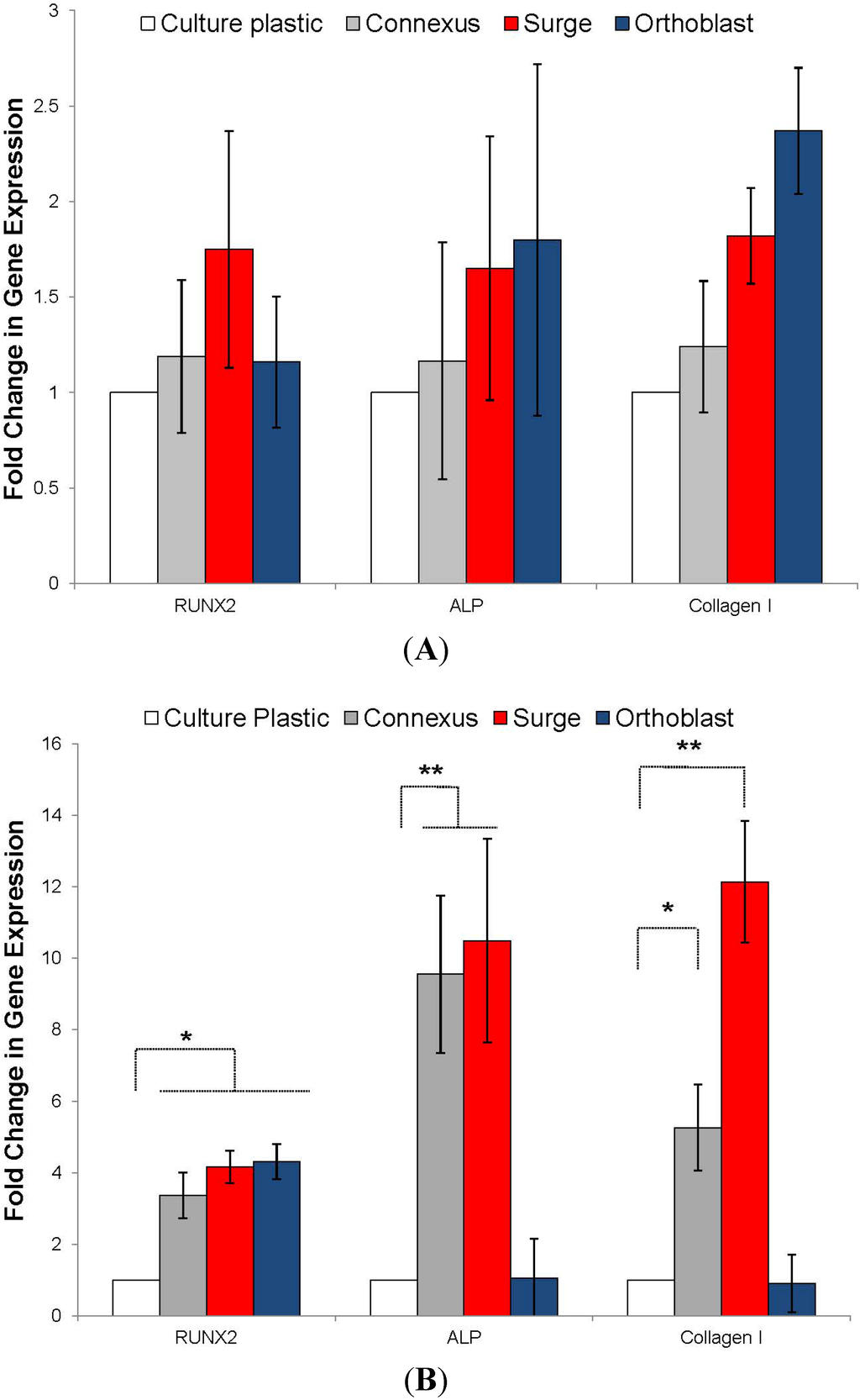 Relative expression of Runx2, alkaline phosphatase (ALP), and type I collagen as a fold increase over tissue culture plastic by cells cultured in 2D with 1:10 diluted extracts from DBM and DBM-poloxamer putties after four days (A) and eight days (B) of incubation at 37 °C. Error bars represent standard error of the mean (n = 4 per substrate). Asterisks denote significant difference (* p < 0.05, ** p < 0.01) by ANOVA and Tukey post test.