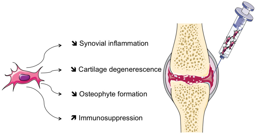 Schematic representation of mesenchymal stem cell (MSC)-based therapy via intra-articular injection in the treatment of rheumatic diseases. Through the release of trophic factors and cell contact, MSCs may act to reduce cartilage degeneration, osteophyte formation and synovial inflammation. MSCs may also have systemic properties that may be of interest in extra-articular manifestations of rheumatic diseases.