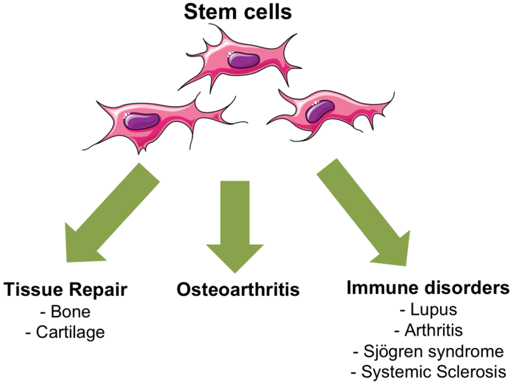 MSC-based cell therapies represent innovative strategies for the treatment of rheumatic diseases for which currently available treatments are limited and rarely restore the full functions of the tissue. Several studies are ongoing. We have listed in Table 1 all the studies currently under recruitment and referenced in ClinicalTrials.gov registry. We look forward to the results because we need to evaluate clinical efficacy of stem cells through controlled randomized double-blind trials.