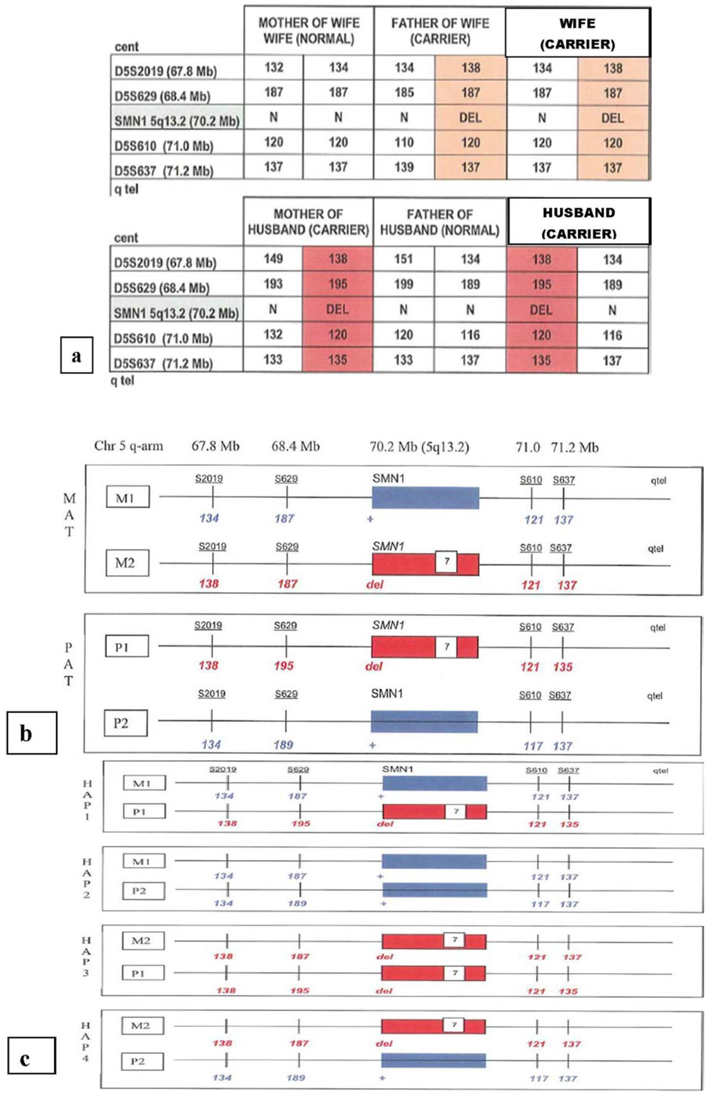 Pre-PGD workup for a family with a previous child with spinal muscular atrophy. Panel (a) shows how the study of both parents and grandparents allows the phasing of the SMN mutation relative to polymorphic short tandem repeat (STR) markers; panel (b) shows the maternal and paternal haplotypes M1, M2, P1 and P2 and the distance of the STR markers from the SMN gene; panel (c) shows the four predicted fetal haplotypes. These reflect a Hardy–Weinberg equilibrium of one homozygous non-carrier, two heterozygous carriers and one that is homozygous and affected. Short tandem repeat markers linked with the SMN mutation are shown in red. DEL indicates the presense of the exon 7 (840 C>T) mutation.
