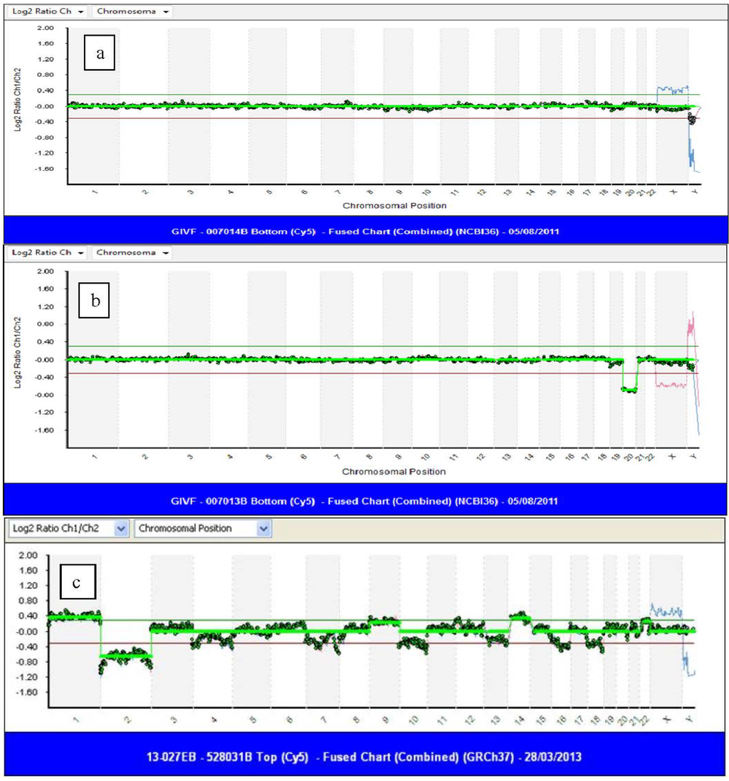 Array comparative genomic hybridization (aCGH) tracing after trophectoderm biopsy: (a) normal male embryo (female embryo control in blue); (b) female embryo with monosomy for chromosome 20 (male control in red); (c) an excellent quality blastocyst showing chaotic chromosome abnormalities. Nearly every chromosome is aneuploid.