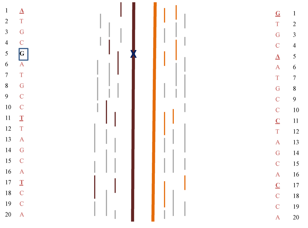 Illustration of SNP analysis in fetal DNA. Dark brown and light brown heavy lines indicate two homologs present in fetal DNA. Thin dark brown and light brown lines represent DNA fragments that may contain SNPs and map uniquely to their corresponding chromosome while thin grey lines are DNA fragments that can map to either homolog. 1–20 refers to representative positions along each chromosome, some of which are the sites of SNPs (bold, underlined bases). Analysis of the fragments present, comparison with the parent’s SNPs, and mapping to reference genome sequences allows construction of the fetal haplotypes. The analysis potentially allows identification of inherited disease causing mutations (e.g., position 5, G boxed) either through identification of the specific fragments with the mutation or through closely linked SNPs.