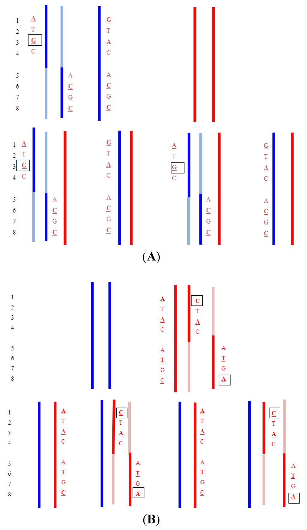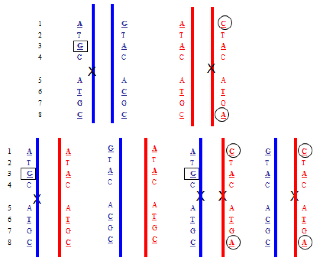Segregation of an autosomal recessive disorder. Blue indicates paternal chromosomes and red maternal chromosomes. Upper shows the haplotypes for the parents and the lower shows the four different segregation possibilities. X denotes a disease mutation. The identification of the boxed G SNP in the maternal plasma would indicate that the paternal haplotype that carries the mutation was present in the fetus. An excess of the circled C and A SNPs in the maternal plasma (relative to the A and C) would indicate the maternal haplotype with the mutation was present in the fetus.