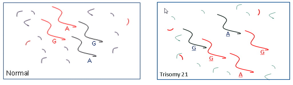 Use of SNPs to detect trisomy 21. Red denotes fetal DNA, black denotes maternal DNA. Left: In this example, for a normal pregnancy, the father is genotyped and known to be GG and the mother GA. The fetus inherited a G allele from the father and A allele from the mother. For a normal pregnancy, the G/A DNA fragment ratio is 1.0 regardless of the fetal fraction percentage. Right: Trisomy 21 is present due to a maternal non-disjunction resulting in a fetal genotype AGG. The G/A fragment ratio will be dependent on the fetal fraction. For example, if the fetal fraction is 20%, the G/A ratio will be approximately ((20% × 2) + (80% × 1))/((20% × 1) + (80% × 1)) = 1.2. The departure from the normal ratio, 1.0, provides evidence for trisomy 21.