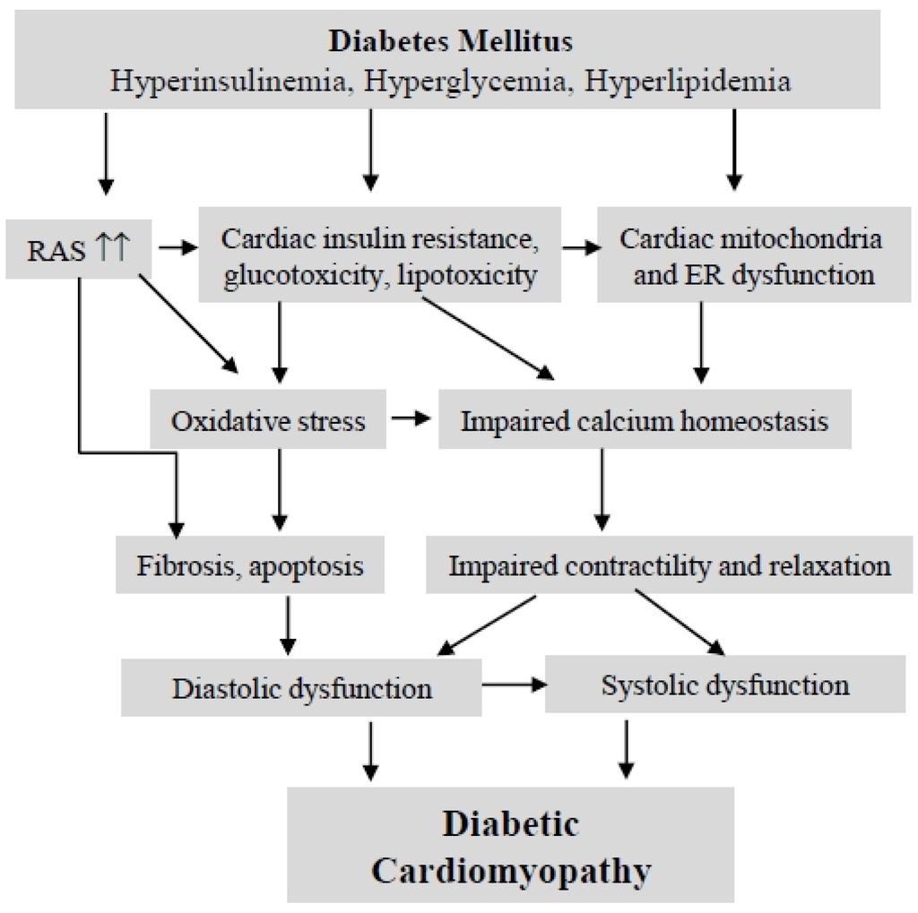 The epidemic of obesity and a sedentary lifestyle is projected to result in over 439 million individuals with diabetes mellitus (DM) worldwide by 2030 []. DM is an important and prevalent risk factor for congestive heart failure. Indeed, cardiovascular complications are the leading cause of diabetes-related morbidity and mortality (65%) []. Heart failure (HF) is a syndrome that represents the end stage of different forms of heart disease, affecting nearly 5.8 million people in the United States, and more than 23 million people worldwide []. HF results in high hospitalization rates and mortality; up to 40% of patients die within one year of their first hospitalization, resulting in significant health and financial burdens on patients and society [,]. The Framingham report indicates that diabetes increases the risk of heart failure, independent of other contributing risk factors [,]. The risk of heart failure in diabetic subjects was increased 2.4-fold in men and five-fold in women. This risk was independent of age, hypertension, obesity, coronary artery disease and hyperlipidemia. The impairment of left ventricular function in diabetic patients without underlying coronary artery disease or hypertension is now recognized as a distinct clinical entity termed “diabetic cardiomyopathy” [], which was first described by Rubler et al., who reported data from four diabetic patients with heart failure without evidence of hypertension, coronary artery disease, valvular or congenital heart disease []. Increased left ventricle (LV) diastolic stiffness and relaxation disturbances are recognized as the earliest manifestation of diabetes-induced cardiac remodeling and have been noted in 27%–70% of asymptomatic diabetic patients [,]. Of note, left ventricular hypertrophy, which is a relevant prognostic risk factor in heart disease, occurred more frequently in diabetic patients and is a major contributor for the increased ventricular stiffness and diastolic dysfunction []. LV systolic dysfunction supervenes only at later stages of DCM. A decreased LV systolic ejection fraction (LVEF) provides a good reflection of the severity of systolic dysfunction and heart failure. Though the pathogenesis and pathophysiology of DCM is multifactorial and poorly understood, current evidence suggests that diabetes affects cardiac remodeling through a variety of mechanisms (Figure 1), including over-activation of the renin-angiotensin system, insulin resistance, metabolic disturbances (hyperglycemia, hyperinsulinemia and hyperlipidemia), fibrosis and impairment of calcium homeostasis [,,]. Given the common and increasing prevalence of diabetes in the general population, diabetic cardiomyopathy is a significant and growing public health concern.