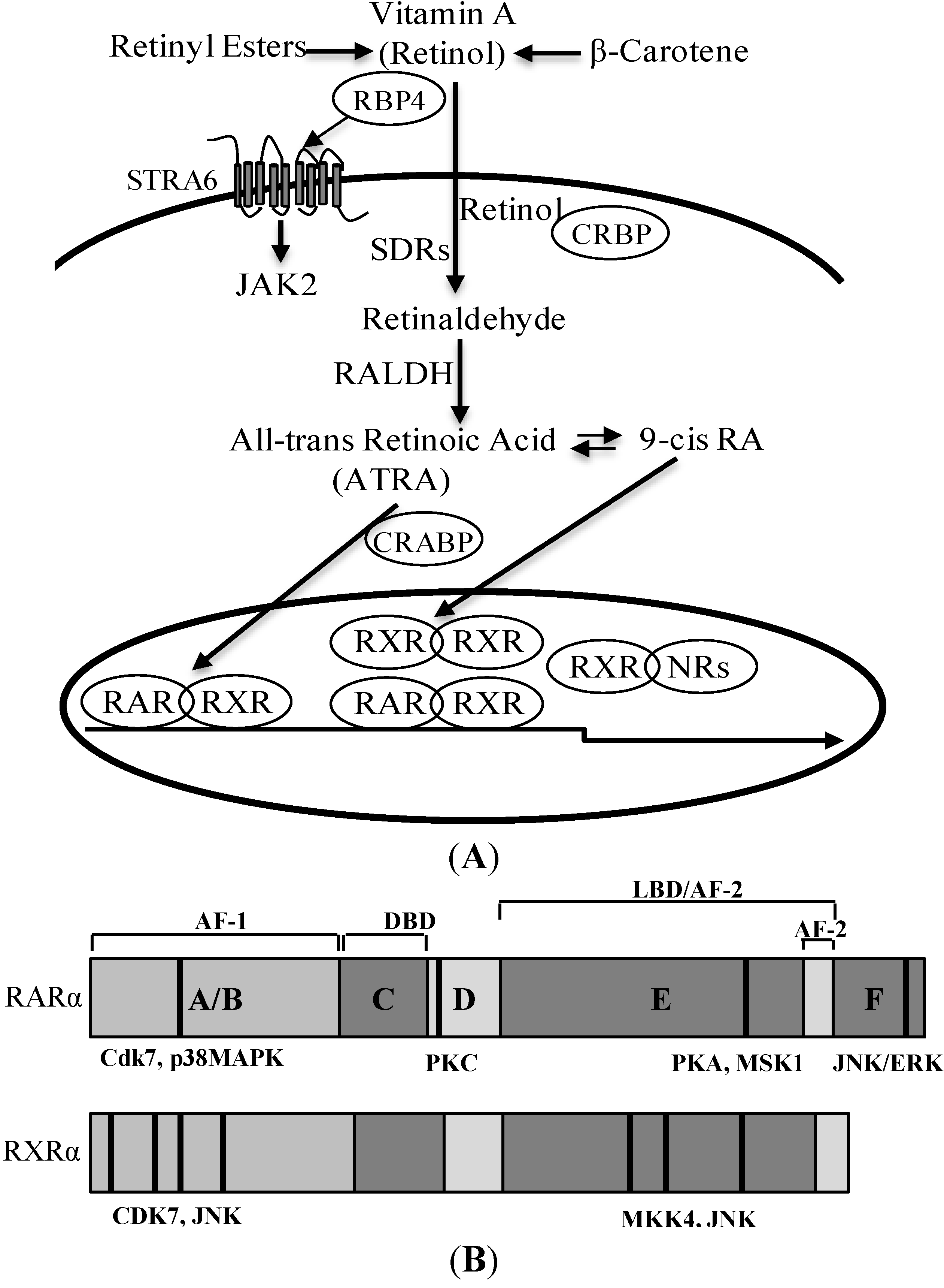 Retinoid metabolism and the structure of retinoid receptors. (A) Retinol binds to RBP4 (retinol binding protein 4) in plasma. RBP4 bonds to STRA6, resulting in the activation of the JAK2 signaling pathway. Retinol bound with cellular retinol-binding protein (CRBP) is converted to retinaldehyde by short-chain dehydrogenase/reductase (SDR); and then to all-trans retinoic acid (ATRA) by retinaldehyde dehydrogenase (RALDH); (B) Schematic representation of the functional domains and the major phosphorylation sites of RARα (retinoic acid receptor α) and RXRα (retinoid X receptors α). The DNA-binding domain (DBD) and the ligand-binding domain (LBD) are schematically represented (not to scale). The functional AF-1 and AF-2 domains lie in the A/B and E regions, respectively. Phosphorylation sites are shown in a bold black line.