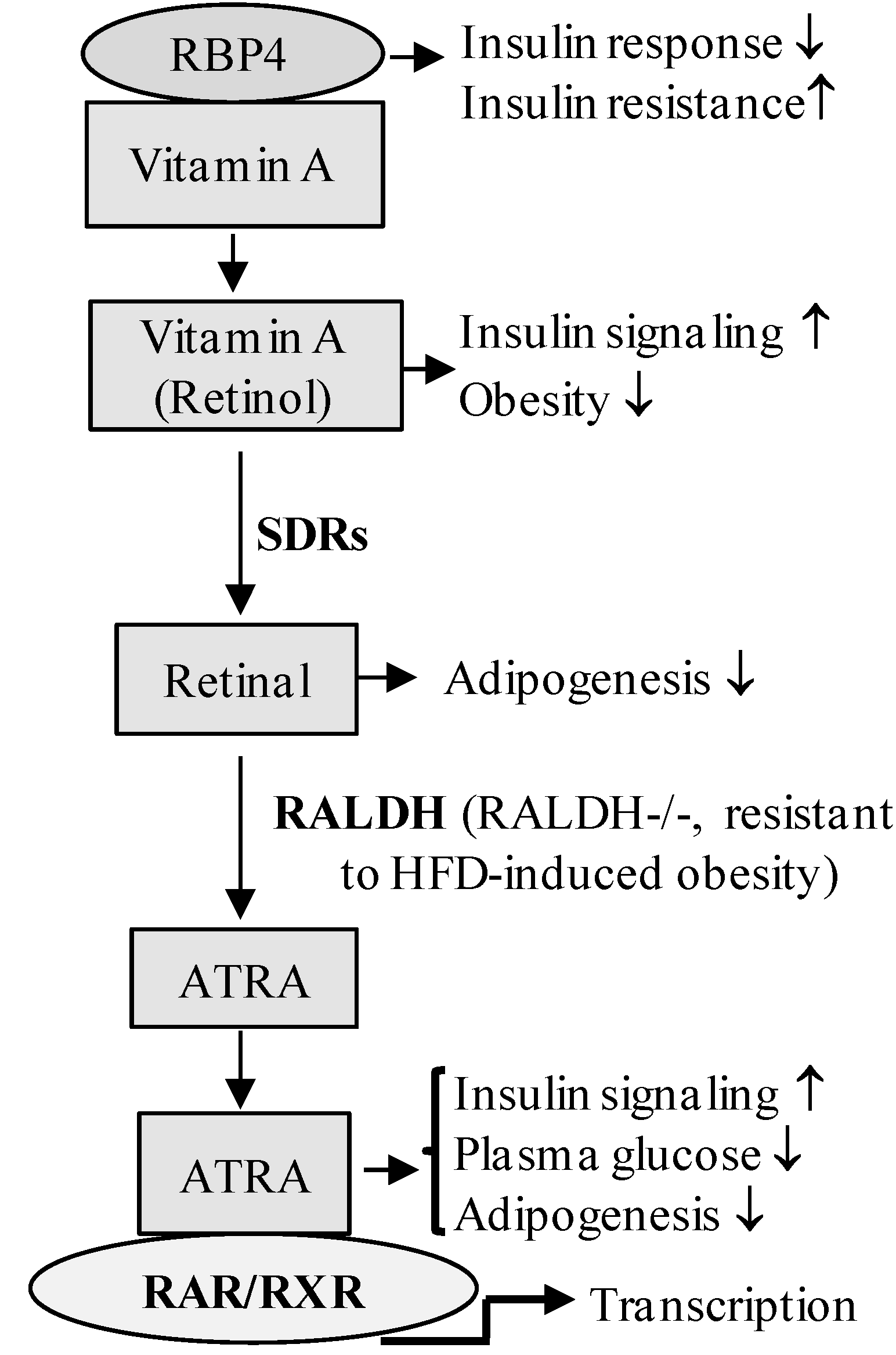Retinoid-mediated signaling in the regulation of glucose/lipid metabolism. The schematic diagram represents the involvement of retinoid signaling components in the regulation of glucose/lipid metabolism in the development of obesity and diabetes. RBP4, retinol binding protein 4; SDR, short-chain dehydrogenase/reductase; RALDH, retinaldehyde dehydrogenase; HFD, high fat diet; RALDH−/−, RALDH knockout mice.