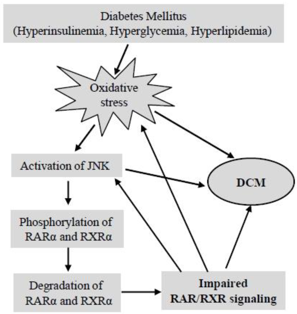 - Singh, A.B.; Guleria, R.S.; Nizamutdinova, I.T.; Baker, K.M.; Pan, J. High Glucose-induced repression of RAR/RXR in cardiomyocytes is mediated through oxidative stress/JNK signaling. J. Cell. Physiol. 2012, 227, 2632–2644. [Google Scholar] [CrossRef]
