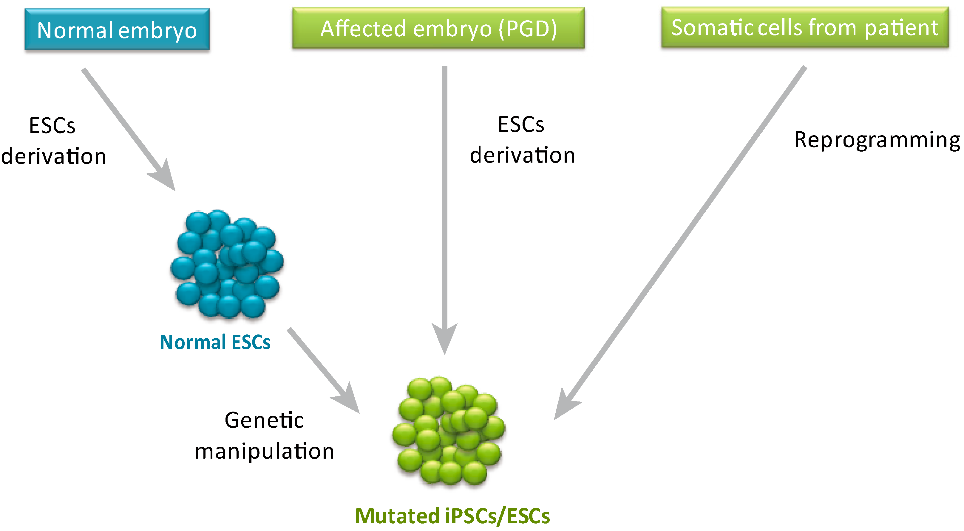 Human pluripotent stem cell-based models for genetic disorders can be generated by different techniques. Mutated human pluripotent stem cells can be derived by genetic manipulation of normal pluripotent stem cells, from affected embryos (identified by PGD), or from adult patients (by reprogramming of somatic cells).