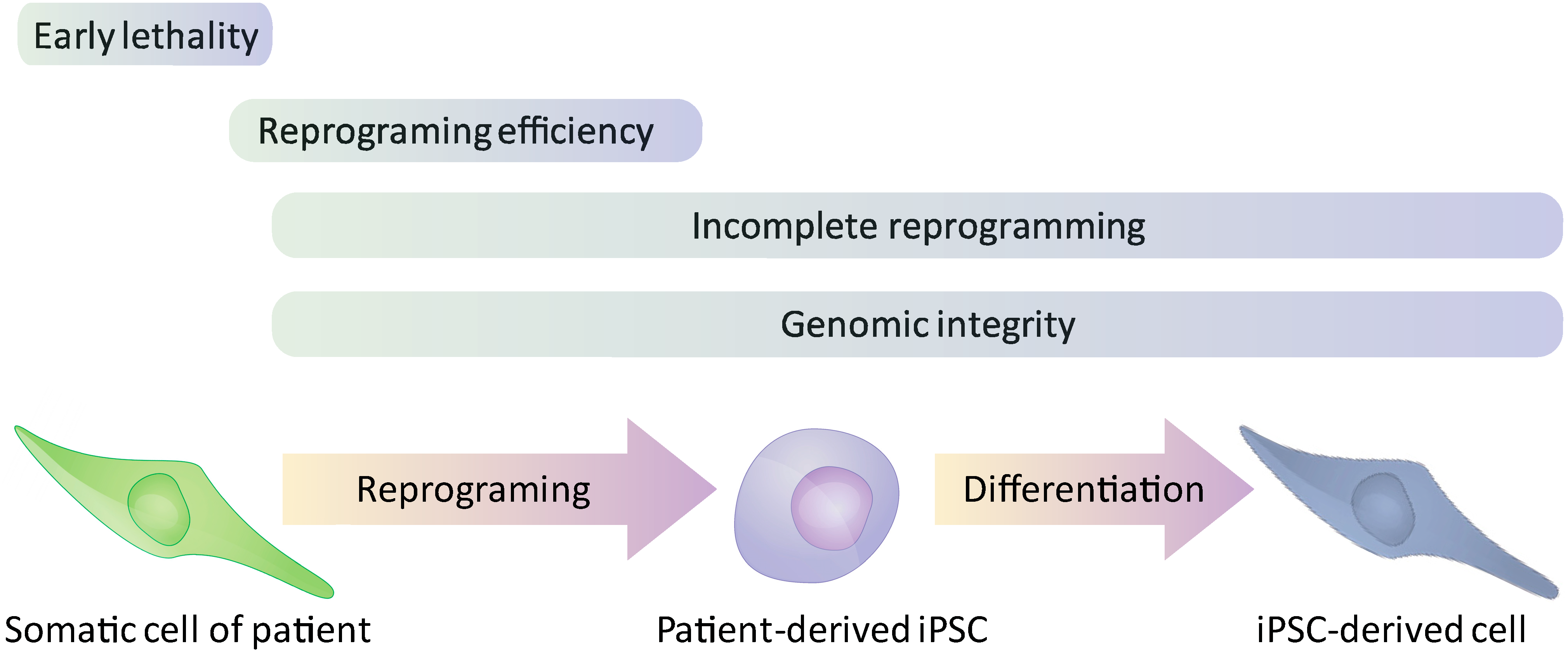 Nevertheless, possible drawbacks in modeling genetic disorders by iPSCs suggest that some disorders or specific aspects within a given disease might be better modeled in ESCs than iPSCs. The generation of a faithful iPSC-based model might be disrupted due to the following reasons (see Figure 2): (1) Incomplete reprogramming as a result of “Epigenetic memory” of the original somatic cells [21,22,23]; (2) Mutations accumulated during the reprogramming process [24] and deleterious effects (such as chromosomal instability, [25]) of the reprogramming process on the genome integrity of iPSCs; (3) Genetic aberrations that significantly decrease the reprogramming efficiency [26]; (4) The absence of appropriate sources of somatic cells such as in the cases of genetic aberration and aneuploidies that lead to very early embryonic lethality [6].