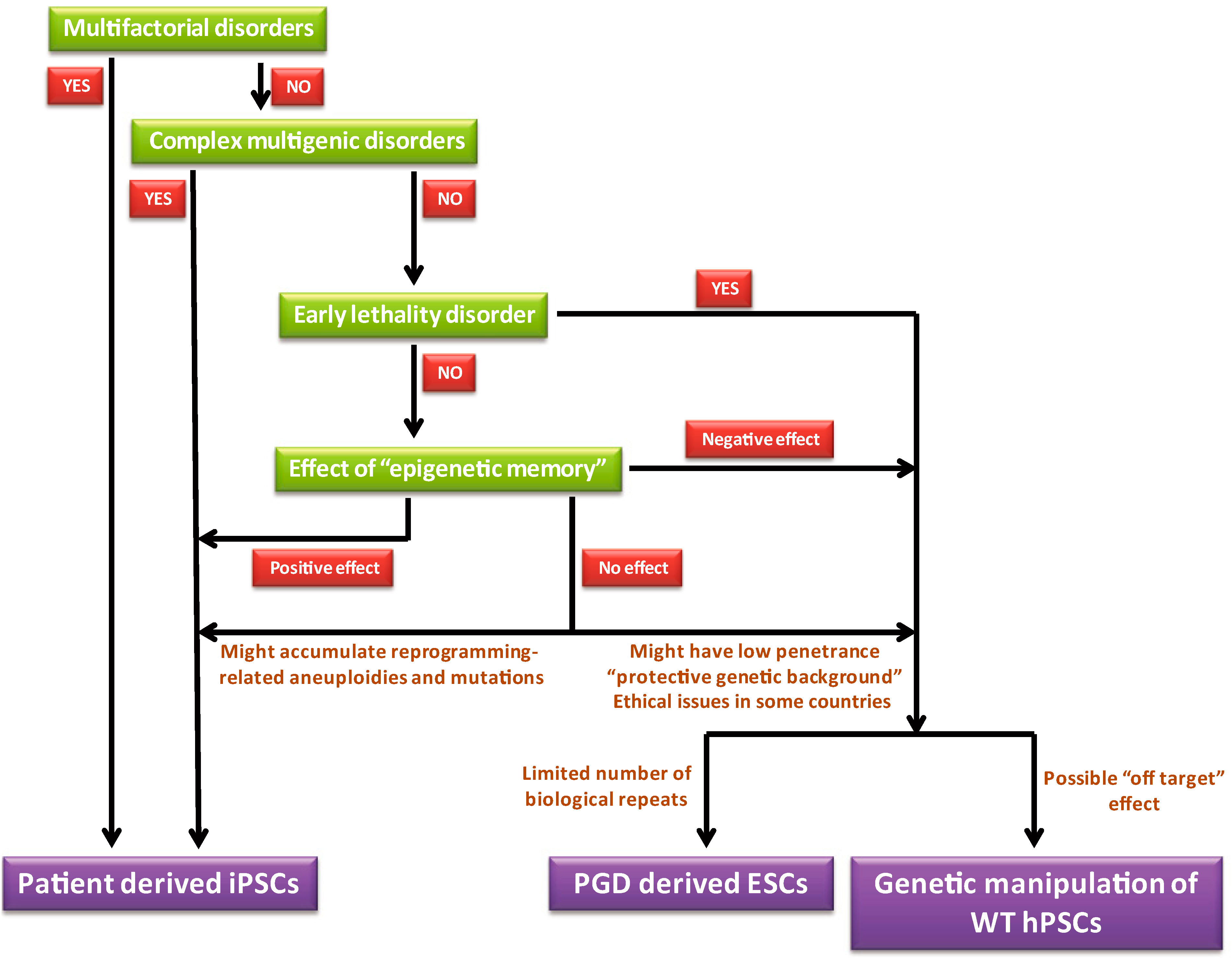 Scheme depicting the steps in choosing the appropriate system for disease modeling. While in some cases there is only one possible option (either ESCs or iPSCs), in other cases both ESCs or iPSCs can be used and the decision between the two methods should be done after the consideration of the advantageous and disadvantageous of each one of the options (some of them are described in the scheme).