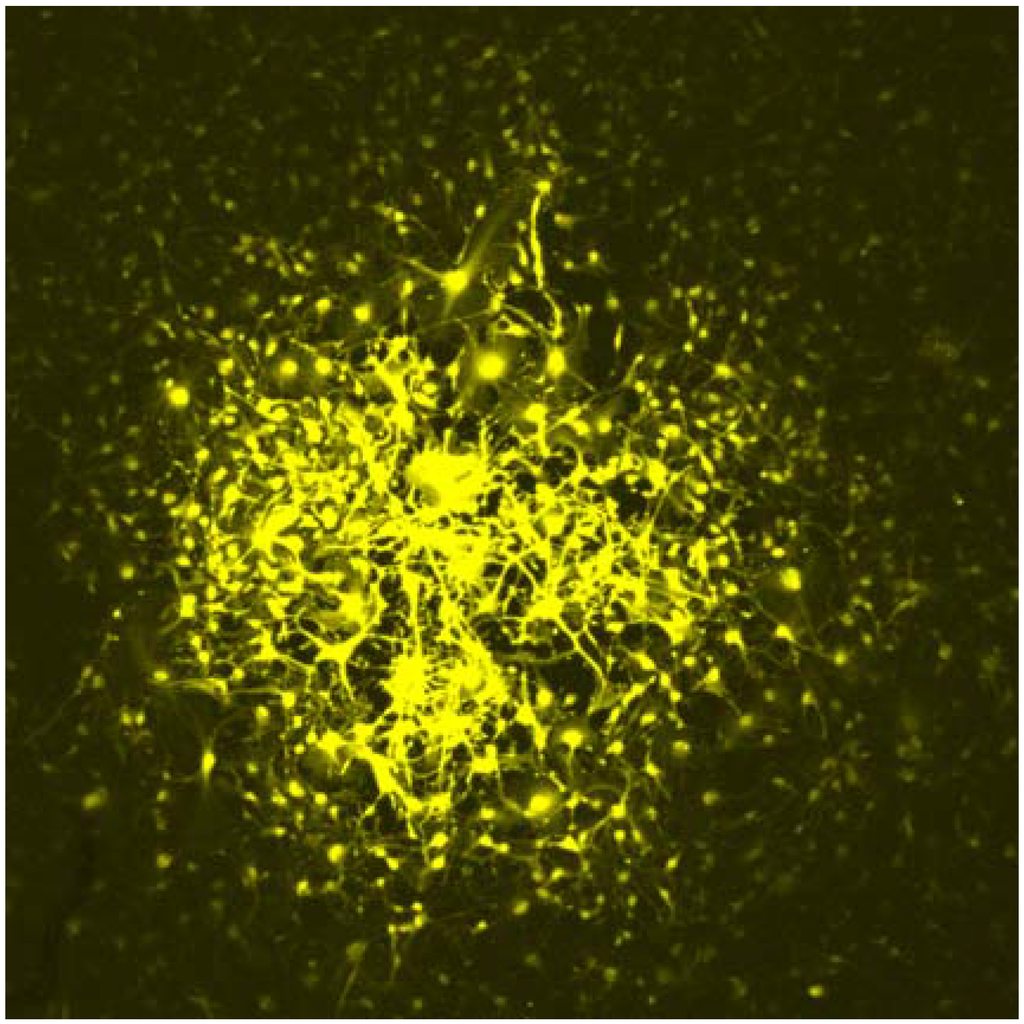 A Day 70 neuronal culture from control iPSCs, imaged 30 min after one cell was micro-injected with NeuroBiotin™ and detected using Streptavidin-Cy3, reveals the highly interconnected nature of neurons and astrocytes generated in vitro. Image courtesy of Patrick Fortuna and Refik Kanjhan (University of Queensland, Brisbane, Australia).