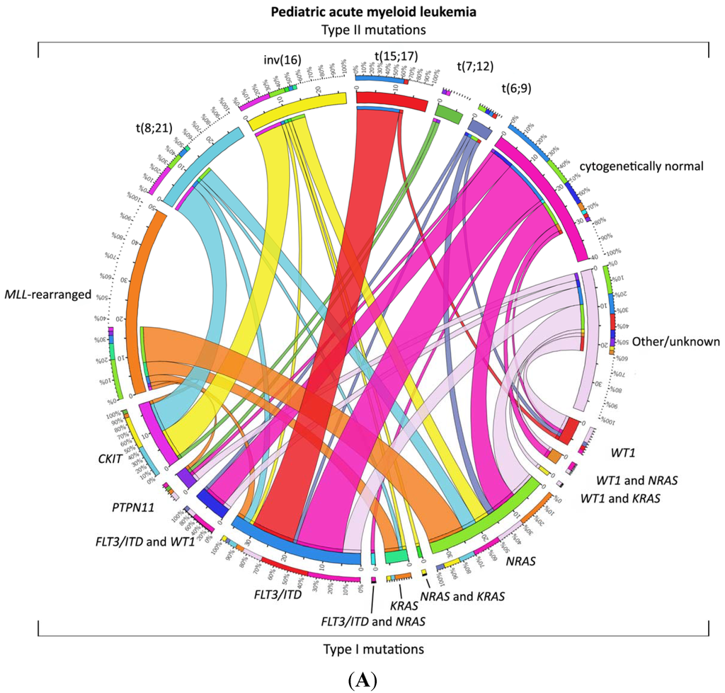 Distribution of Type I/II abnormalities in pediatric AML. (A) Cooperating Type I and Type II mutations in pediatric AML. The circos plot [] depicts the frequency of the Type II mutations and co-occurrence of Type I mutations in patients with de novo pediatric AML. The length of the arch corresponds to the frequency of the Type II mutation and the width of the ribbon with the percentage of patients with a specific Type I mutation or a combination of Type I mutations. FLT3/ITD denotes FLT3 internal tandem duplication; (B) Cooperating Type I and Type II mutations in cytogenetically normal AML. The circos plot [] depicts the frequency of the Type II mutations and co-occurrence of Type I mutations in patients with de novo pediatric cytogenetically normal AML. The length of the arch corresponds to the frequency of the Type II mutation, and the width of the ribbon with the percentage of patients with a specific Type I mutation or a combination of Type I mutations. FLT3/ITD denotes FLT3 internal tandem duplication.