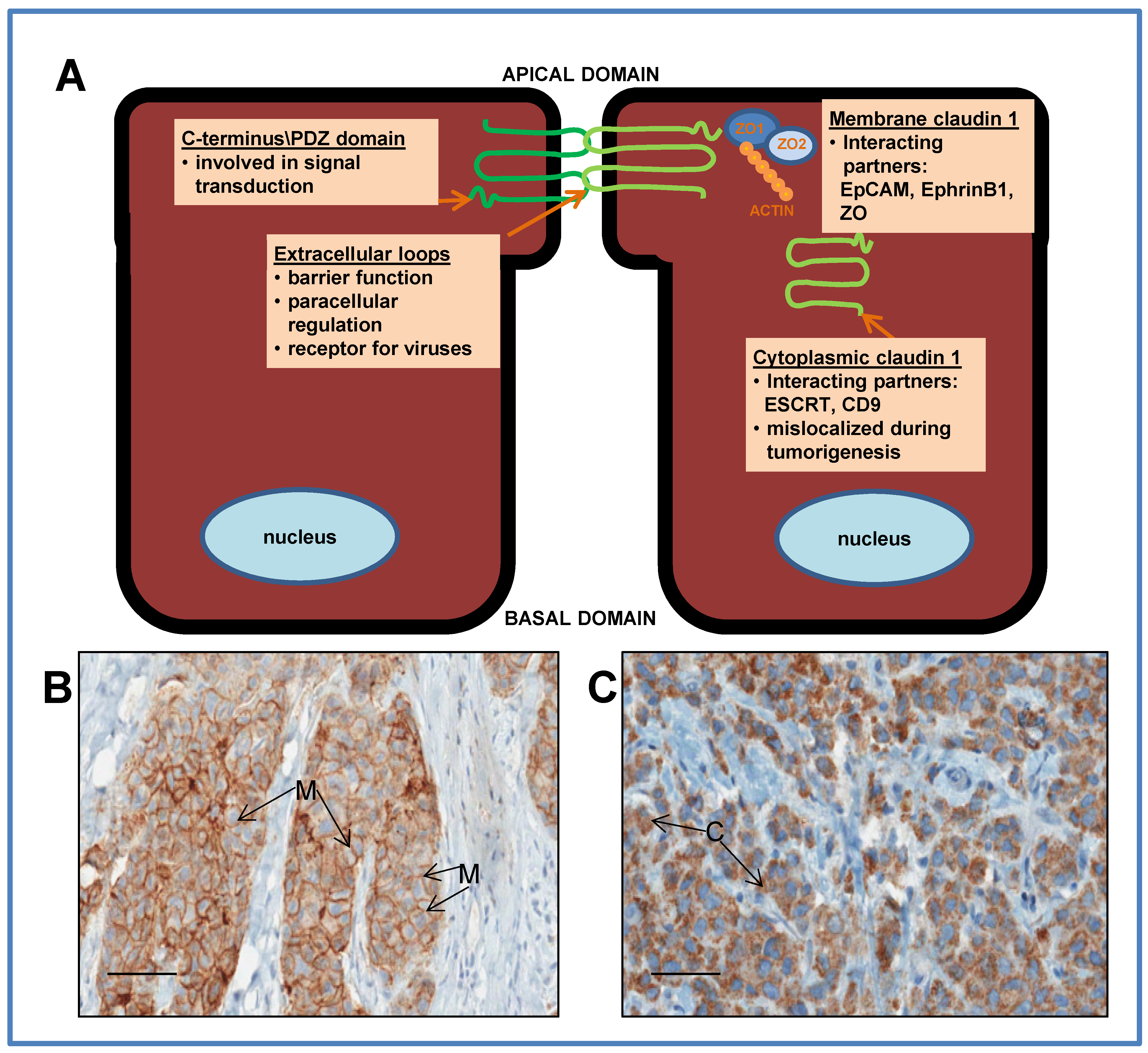 (A) Schematic representation of ductal epithelial cells, depicting the relative location and function of the claudin 1 protein in the membrane at the tight junction, and in the cytoplasm. The protein has 4 transmembrane domains with 2 extracellular loops with amino and carboxy terminal tails extending into the cytoplasm. The extracellular loops are essential for maintaining tight junction function, epithelial barrier integrity and regulating paracellular ion permeability. The C-terminus interacts with many signaling pathways through a PDZ domain. Through this domain, claudin 1 interacts with other tight junction proteins such as zona occludins (ZO). In addition to a tight junction function, membrane claudin 1 may act as a tumor facilitator by promoting collective migration during breast cancer progression; (B) Immunostaining of a breast tumor with claudin 1 antibody depicting membrane (M) staining and (C) depicting cytoplasmic (C) staining. Bars = 50 μm.