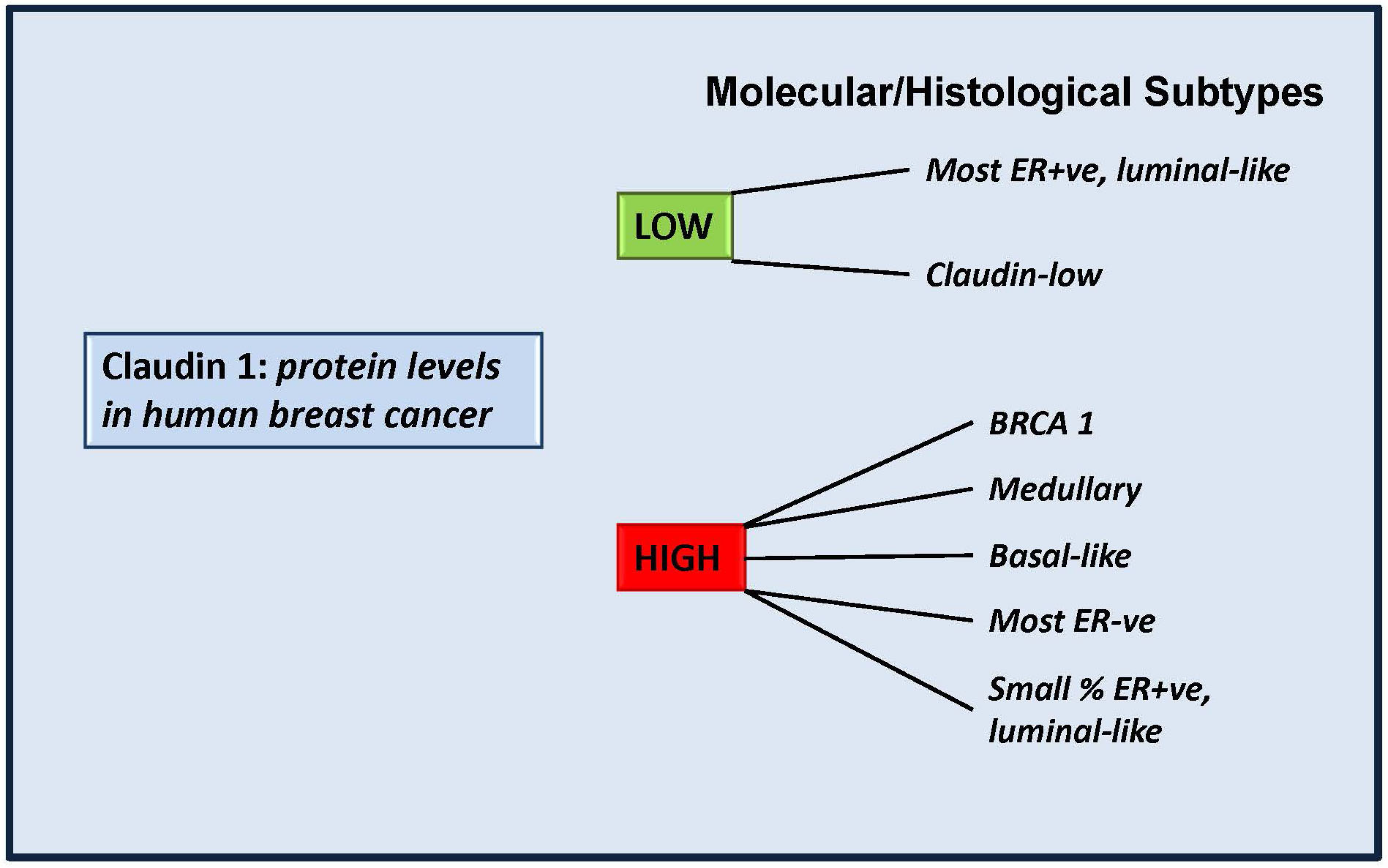 Claudin 1 levels in molecular/histological subtypes of breast cancer. Some molecular subtypes of human invasive breast cancer have been shown to exhibit low levels of claudin 1, in line with studies which suggest claudin 1 plays a tumor suppressor role in those tumors. However some aggressive forms exhibit high endogenous levels of claudin 1 and it is still to be determined whether in these tumors, claudin 1 is playing a tumor-facilitating role. BRCA1: a hereditary breast cancer. Patients carry a mutation of the breast cancer 1 (BRCA1) gene. Medullary: a subset of basal-like carcinomas that exhibit a high rate of p53 mutations [108].
