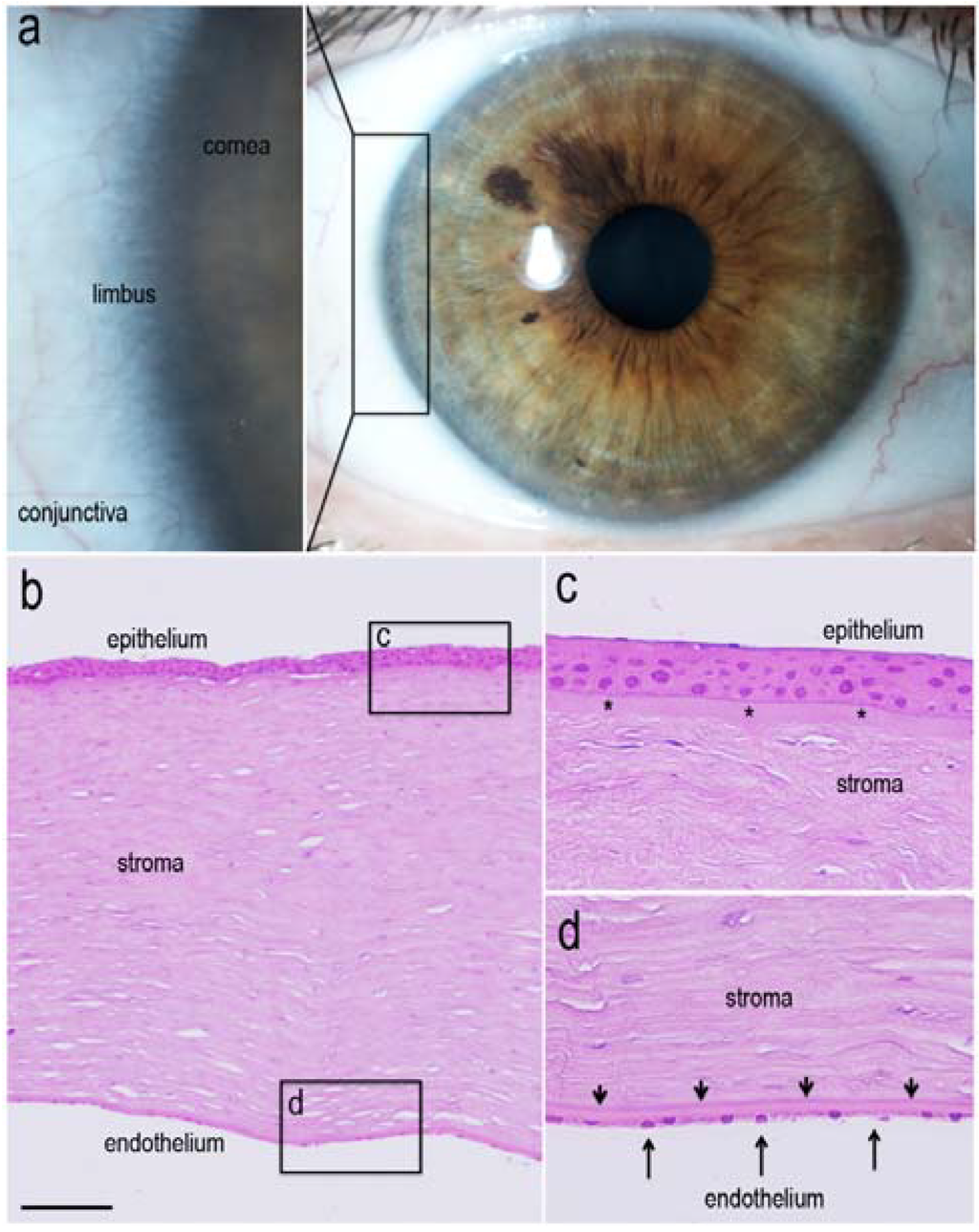 The corneal limbus is the circumferential anatomic area, approximately 1.5 mm wide, which separates the clear cornea from the opaque sclera (a); The limbal region represents the “reservoir” for LSCs in the ocular surface. In a cross-section of the human cornea stained with hematoxylin-eosin, (b) to (d), details of its main layers can be observed. The cornea is composed of a stratified non-keratinized squamous epithelial layer (epithelium), the stroma and an endothelial cuboidal layer (endothelium) (b); The corneal epithelium (48 to 55 µm thick) consists of the outermost layer, which presents five to seven stratified cell layers (c), limited posteriorly by Bowman’s layer (10 to 12 µm thick; c, asterisk). The stroma (480 to 510 µm thick; b), composed of compacted collagen lamellae and keratocytes (c and d), offers transparency and scaffolding to maintain the shape of the cornea in its middle portion. The stroma is separated from the endothelium (about 5 µm thick; d, large arrows) by Descemet’s membrane (8 to 10 µm thick; d, narrow arrows), which acts as a basement membrane for the corneal endothelial cells (d). Bar = 150 µm for b; Bar = 25 µm for c and d.