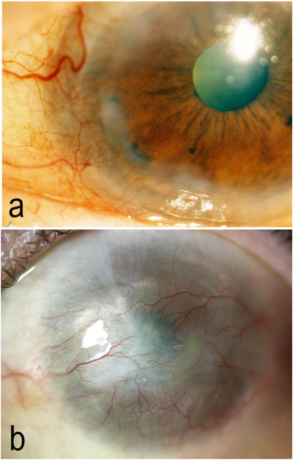 Clinical findings related to Limbal Stem Cell Deficiency (LSCD). Limbal deficiency secondary to ocular cicatricial pemphigoid with the presence of peripheral newly formed vessels leading to a loss of corneal transparency (a); Limbal deficiency, secondary to a chemical burn (bleach) of the ocular surface leads to a corneal conjuntivalization and neovascularization with loss of transparency (b). LSCD can be treated with cell therapy techniques such as cultured limbal epithelial transplantation (CLET) or cultured oral mucosal epithelial transplantation (COMET).