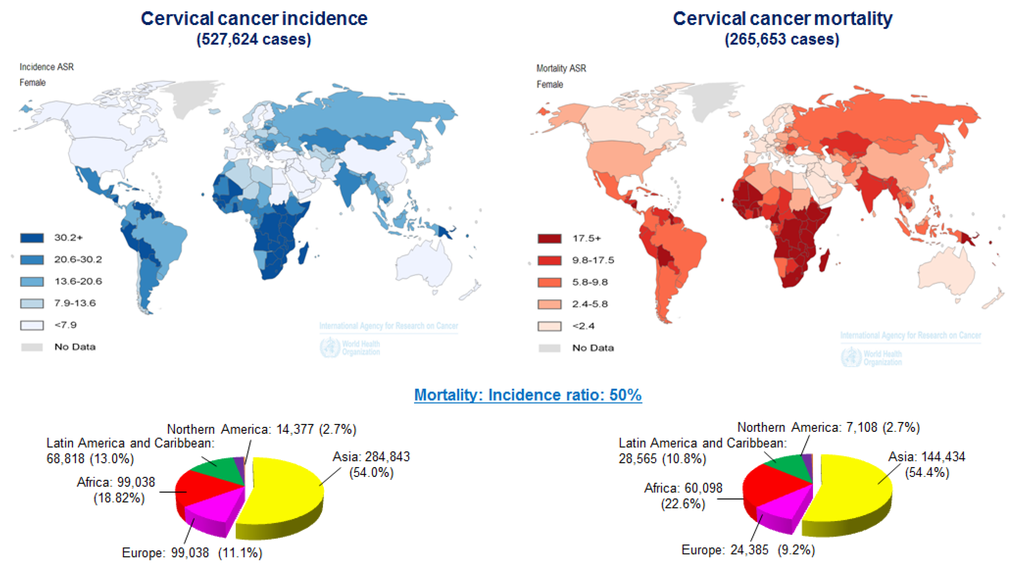Worldwide cervical cancer incidence and mortality in 2012. Geographical distribution of cervical cancer incidence (left) and mortality (right) worldwide. Approximately 85% of cases occur in developing countries. Mortality: incidence rate ratios for cervical cancer were obtained from GLOBCAN (http://globocan.iarc.fr/).