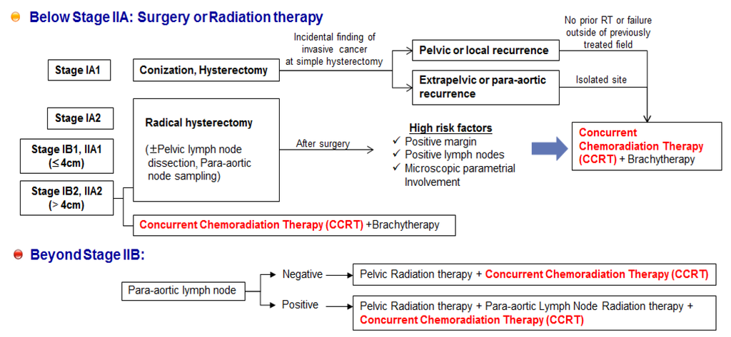 Practice guideline summary for cervical cancer. Concurrent chemoradiation therapy (CCRT) is recommended as the first-line therapy for patients with disease at stage IIB or greater, and as an adjuvant therapy following radical hysterectomy for patients with locally advanced cervical cancer.