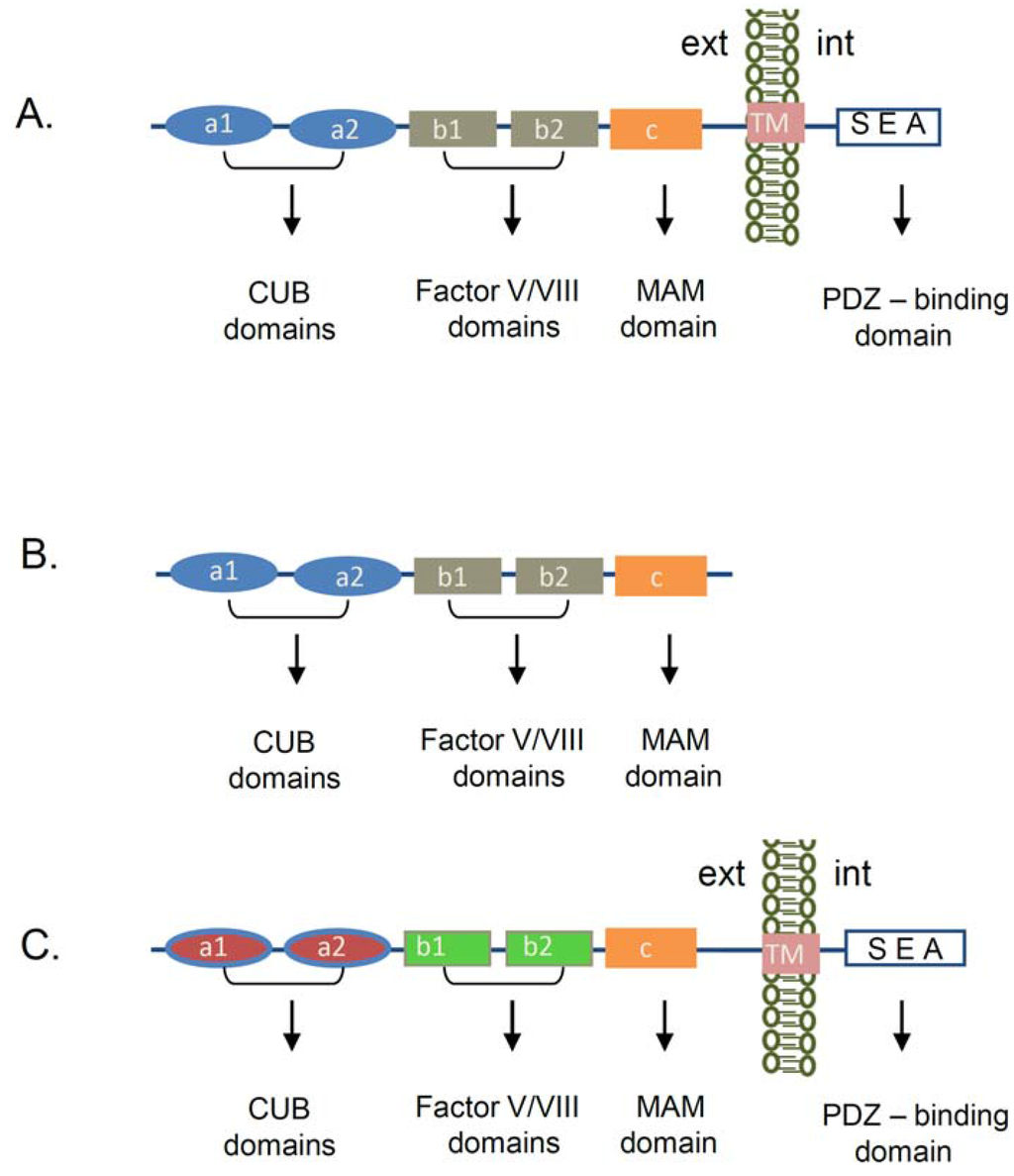 Neuropilin-1 (NRP-1) was first discovered as an antigen that binds to the A5-antibody, raised against neuronal cell surface proteins in the nervous system []. It was originally reported that NRP-1 functions as an adhesion receptor in the nervous system []. Subsequently, studies revealed that NRP-1 is implicated into the axon guidance through its association with semaphorin III (Sema III) family of proteins [,,]. In addition to the nervous system the expression of NRP-1 was also reported in the heart [], endothelial cells [], tumor cells [], stromal cells [], and T cells [,]. We and others also detected NRP-1 mRNA and protein expression in renal cells [,,,]. NRP-1 is a transmembrane protein, consisting of a large extracellular part and a short intracellular tail. While its domain structure shares about 44% amino acid homology and structural similarity with the neuropilin-2 (NRP-2) protein, the molecules differ in regard to their function and ligand binding [] (Figure 1). The NRP-1 extracellular region is organized in five domains: two CUB domains, two Factor V/VIII domains, and a MAM domain, followed by a transmembrane domain and an intracellular tail (Figure 1A). The CUB domains (a1/a2) share homology with complement binding factors C1s/C1r [], Uegf (urchin embryonic growth factor) [], and the bone morphogenic protein 1 (BMP1) []. In the complement system the CUB domains are known to induce protein-protein interactions, which are mainly regulated by the formation of the immunoglobulin-like structures. Several CUB-domain containing proteins were implicated in the regulation of the cellular adhesion and motility [,]. Structural studies have shown that a1/a2 domains of NRP-1 participate in the binding to Semaphorin ligand(s) [], while the two Factor V/VIII (b1/b2) domains promote the association with another NRP-1 ligand VEGF-A164 in mouse or VEGF-A165 in humans []. The NRP-1 extracellular domain crystal structure revealed that the b1 domain is necessary for the VEGF-A164 binding, whereas the b2 domain is mainly involved in the stabilization and coordination of the binding between NRP-1 and its ligands Sema3A or VEGF-A164 []. The so named MAM (c) domain, displays homologies with the extracellular regions of mephrin [], A5 antigen, and the receptor tyrosine phosphatase—µ []. This part of the protein is hypothesized to play an important role in the NRP-1 homodimerization, due to its capacity to induce homophilic interactions []. Structural studies of the transmembrane part of the NRP-1 depicted a putative GxxxG motif, which is thought to participate in receptor dimerization or oligomerization []. The intracellular SEA amino acid sequence in NRP-1,2 is a consensus region shown do promote association with the PSD-95/Dlg/ZO-1 (PDZ) domain containing proteins as the neuropilin interacting protein-1 (NIP1) termed also synectin or RGS-GAIP-interacting protein (GIPC) [].