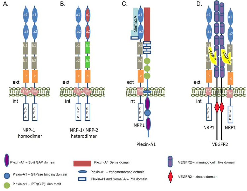 Schematic presentation of the neuropilin-1 signaling complexes. The cartoon represents the complex formation between NRP-1, its ligands, and signaling co-receptors. (A) Formation of the homodimers between the NRP-1 molecules. The homodimerization of NRP-1 receptors can occur via the transmembrane domain of the proteins. The domains of the NRP-1 receptor are described in Figure 1A; (B) Heterodimerization between NRP-1 and NRP-2 receptors. The domains of the NRP-2 receptor are described in Figure 1C; (C) Structure of the functional Sema3A/NRP-1/Plexin-A1 receptor. Via this signaling complex NRP-1 is involved in the regulation of axon guidance signaling in neuronal cells and promotes repulsion signals. The complex is functionally activated upon association of NRP-1 with semaphorin 3A (Sema3A). NRP-1 a1 and a2 domains are involved in the association with Sema3A. Plexin-A1 is a single pass transmembrane protein. In the extracellular part it contains a Sema domain, a PSI motif, as Sema3A and IPT (G-P)-rich motifs. The intracellular part contains a split GAP domain separated by a GTP-ase binding domain. (D) Schematic presentation of the NRP-1 and Vascular Endothelial Growth Factor Receptor 2 (VEGFR2) holoreceptor complex. The interaction between NRP-1 receptor and VEGFR2 co-receptor is regulated via VEGF-A association, but the binding of NRP-1 to VEGFR2 enhances the signaling activity of the VEGFR2 tyrosine kinase receptor. The VEGF-A164/165 binds to the b1/b2 domains of the NRP-1 and this association enhances the VEGFR2 tyrosine autophosphorylation. VEGF-A binds to both receptors and is a crosslink between NRP-1 and VEGFR2. Via this signaling complex NRP-1 is involved the regulation of angiogenesis signaling as well as adhesion and migration of endothelial cells. (ext—extracellular environment, int—intracellular environment, GAP—GTP-ase activating protein, G-P (glycin-proline), IPT—immunoglobulin-plexin-transcription, PSI—plexin, semaphorin, integrin, VEGF—Vascular Endothelial Growth Factor, Sema3A—semaphorin 3A).