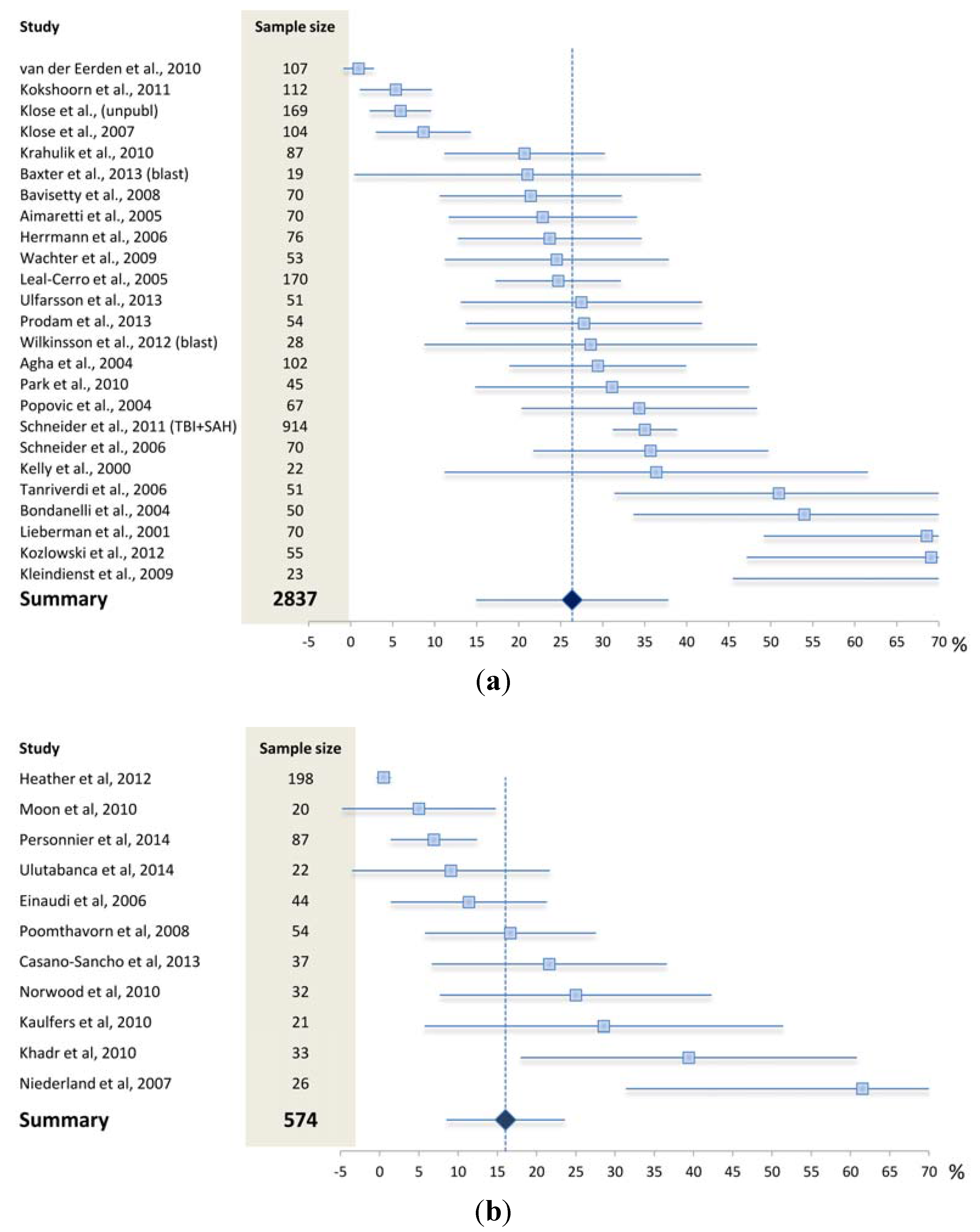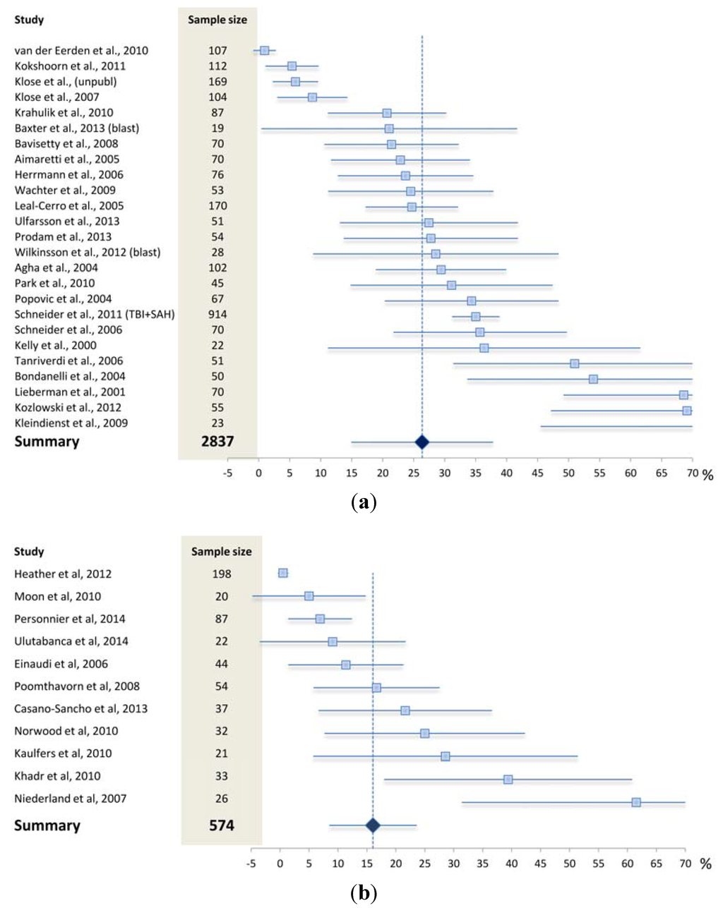 Prevalence rates with 95% confidence intervals in studies assessing pituitary dysfunction after traumatic brain injury in (a) adults and (b) children/adolescents. As indicated by the width of the confidence intervals, most of the available studies were based on rather small populations. Plot produced according to Neyeloff et al. [36].