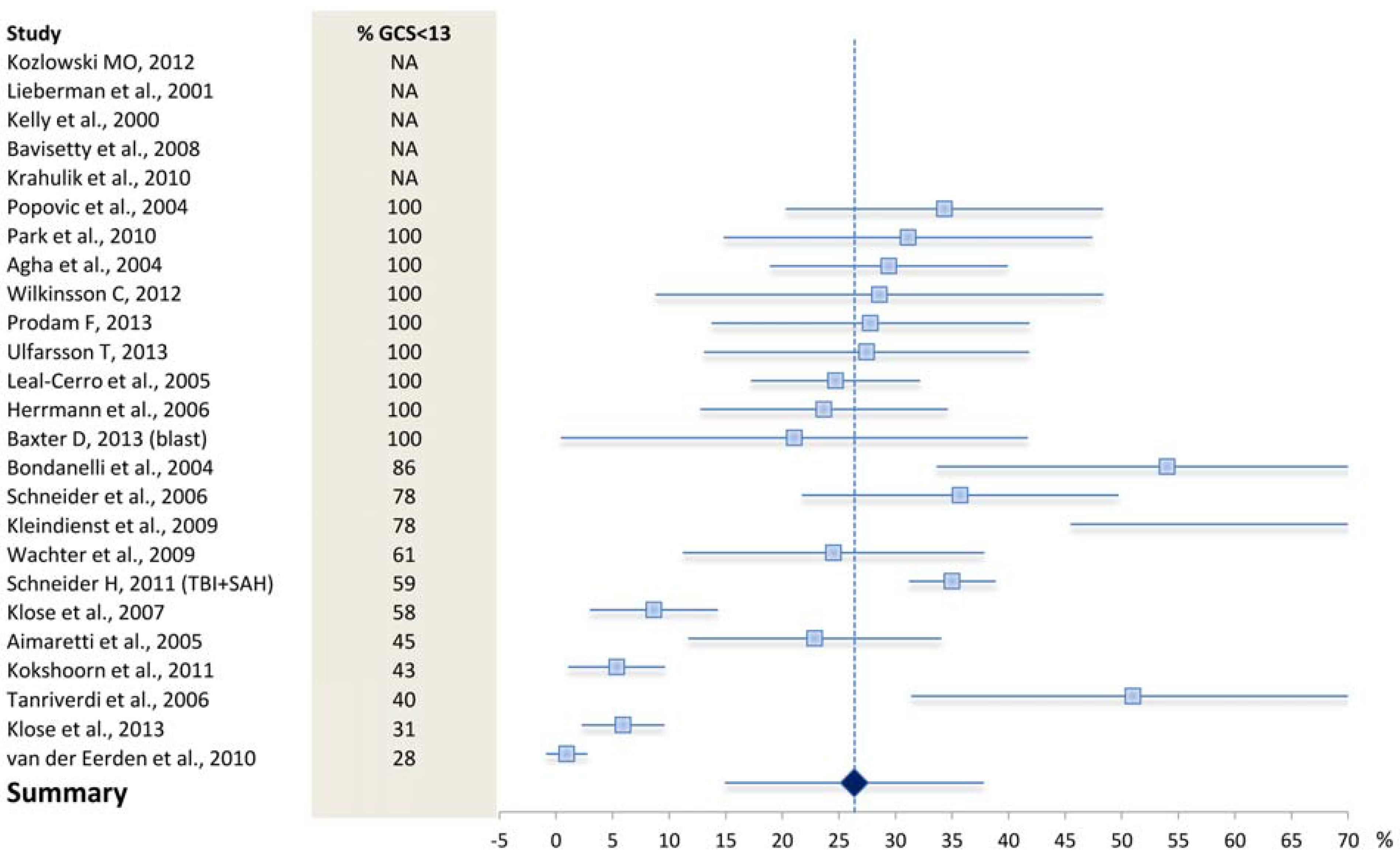 Prevalence rates with 95% confidence intervals in studies assessing pituitary dysfunction after traumatic brain injury in adults. Studies are ranked according to percentage of patients with GCS < 13 (i.e., moderate to severe TBI). Plot produced according to Neyeloff et al. [36]. NA: not available.