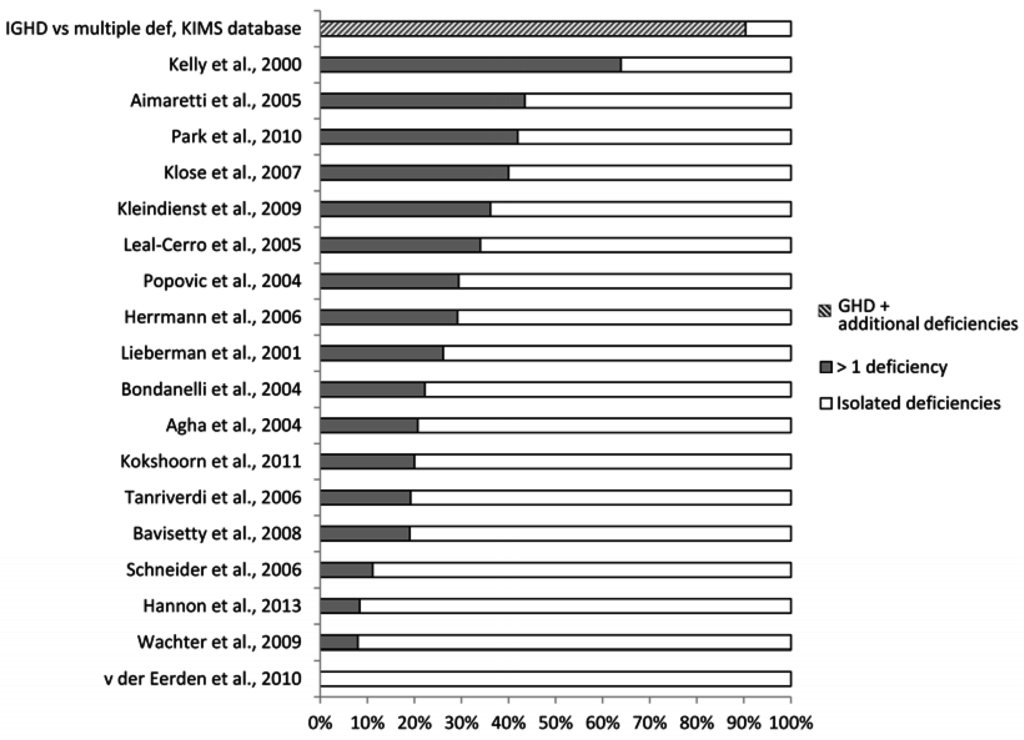 Relative proportion of reported isolated vs. multiple (>1 axis) pituitary deficiencies in TBI. The all-cause proportion of isolated GH deficiency (IGHD) in adult hypopituitary patients reported from the KIMS database is included for comparison [52].