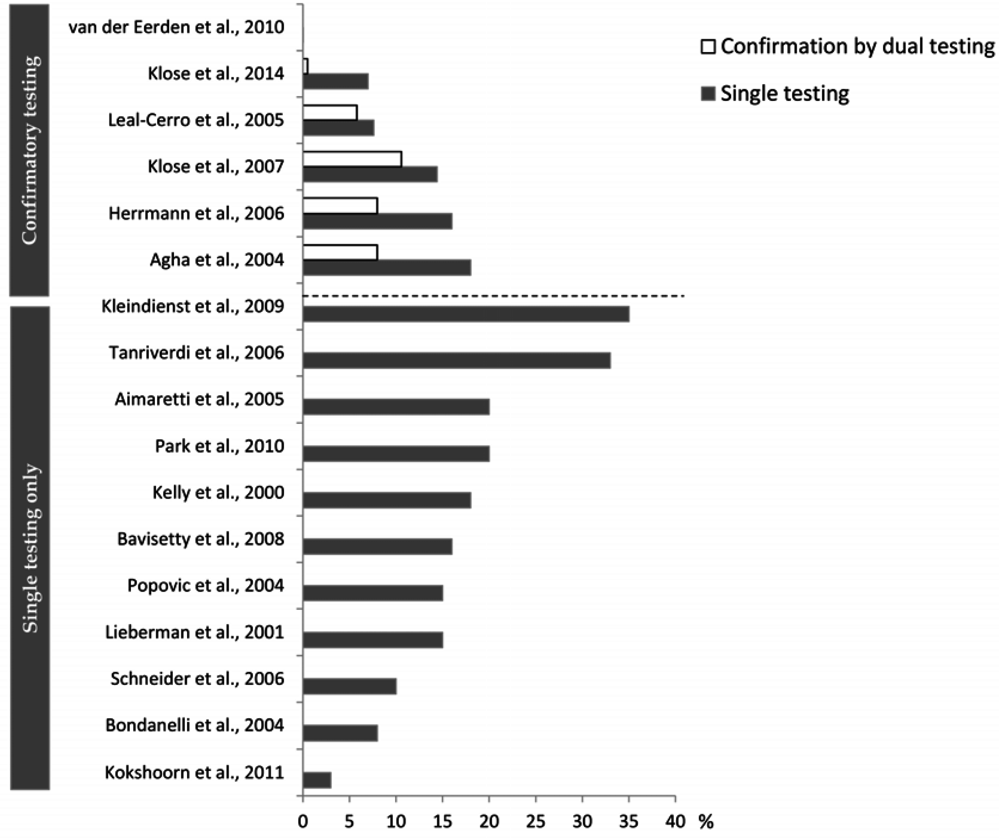 Prevalence of GH deficiency in studies performing single testing versus studies adding a subsequent confirmatory test. The prevalence from both the initial test and the subsequent confirmation test are given for studies performing confirmatory testing.