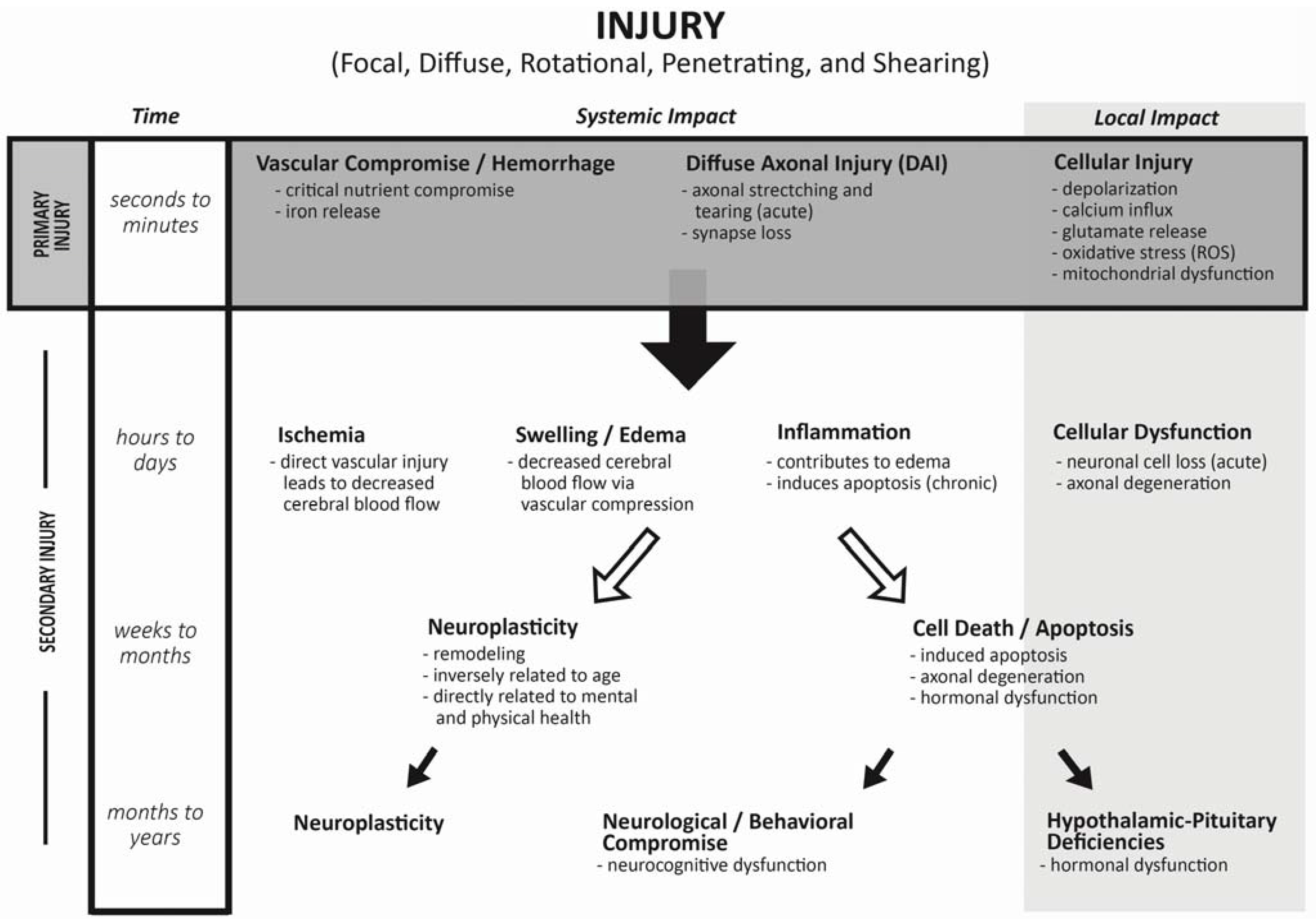 Traumatic brain injury is described as a non-congenital insult to the brain from an external mechanical force causing temporary or permanent neurological dysfunction. TBI is classified as focal due to direct physical impact to the brain (penetrating or contusion), or diffuse following rapidly changing forces. The initial injury or mechanism can include penetrating, tearing, shearing, and/or hemorrhage. Initial physiologic response to TBI, or “primary injury”, involves decrease in cerebral flow leading to decreased protein synthesis and acidosis. Increases in free radical and cation production alter the electro-potential gradient, causing fluid shifts and resulting in swelling and apoptosis (Figure 1).