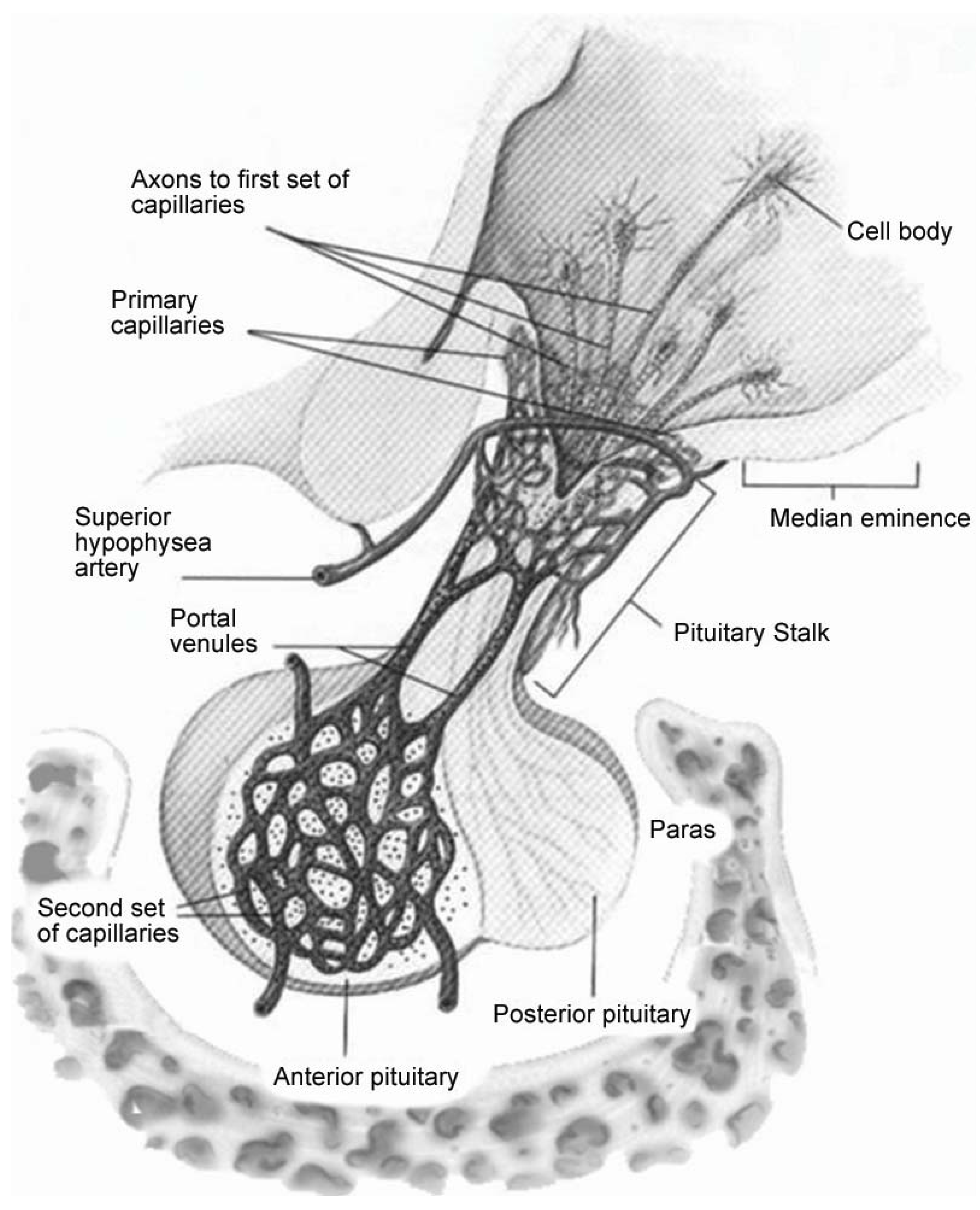 The subsequent reaction to the primary injury (“secondary injury”) is thought to be far more damaging to the surrounding tissue. Secondary injury typically develops within hours or days to weeks following the primary injury [12]. Swelling further compromises vascular support causing distal tissue to be at greater risk of temporary or permanent cell death. Globally, central nervous system (CNS) swelling leads to risk of cerebellar tonsillar herniation which can compromise the respiratory drive center within the midbrain. Similarly, swelling near the hypothalamus compromises the infundibulum that is vital for pituitary vascular supply, communication and function. The long hypophyseal portal vascular system passes through the sellar diaphragm, making the blood supply for the pituitary gland highly vulnerable to mechanical compression (Figure 2).