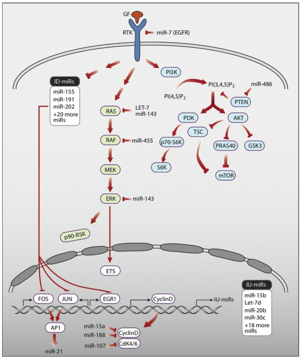 Schematic representation of RTK signaling pathways and representative regulatory microRNAs. Several biochemical signaling pathways are simultaneously activated upon binding of a growth factor (GF) to a receptor tyrosine kinase (RTK). Shown are two major cascades of protein kinases: the RAS-ERK pathway, which culminates in translocation of active ERK molecules to the nucleus, and the PI3K-to-AKT pathway, which requires phosphorylation of the inositol ring of phosphatitylinositol 4,5 bisphosphate at carbon position number 5. Both pathways regulate transcription factors, such as AP1, which comprises dimers of JUN and FOS. Note that many components of the signaling pathways are modulated at the mRNA level by microRNAs. Likewise, several microRNAs are induced or inhibited by RTK signals. They include a large group of microRNA molecules that undergo immediate down-regulation upon activation of EGFR (termed: ID-miRs) and several groups of microRNAs that are up-regulated immediately following RTK activation. For example, the group of IU-miRs is induced as early as 20 min after stimulation of EGFR.