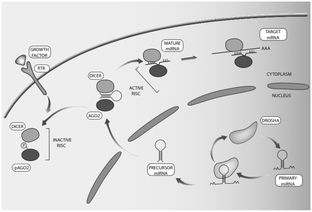 Similarly complex, wave-like patterns of expression might relate to microRNAs (miRNAs or miRs). miRNAs are distinguished by their size of 19–22 nucleotides, and a step-wise biogenesis pathway (see Figure 2). These relatively short RNA molecules are transcribed by RNA polymerase II as large primary transcripts (pri-miRs) that are processed by Drosha to yield 60–110 nucleotide long hairpins containing precursor miRNAs (pre-miRs) [18]. Following transport of the pre-miRs to the cytoplasm, mature miRNAs are excised from the pre-miRs by RNaseIII enzyme called Dicer [19] and loaded into the RNA-induced silencing complex (RISC) [20]. Once completed their maturation, miRNA molecules become competent to target mRNAs for decay or for translational arrest [21,22]. Targeting of an mRNA by a miRNA is mediated by base-pairing between nucleotides 2–8 of the miRNA and a target element in the transcript’s 3’ un-translated region (UTR) [23]. Because miRNAs are negative regulators of gene expression [24], and because each miRNA targets several hundreds of distinct mRNAs molecules [25], they greatly impact cellular processes involving de novo synthesis of proteins, such as tumor progression. This review highlights the cooperative interactions of miRNAs, their mRNA targets and growth factor signaling, in the context of tumor progression.