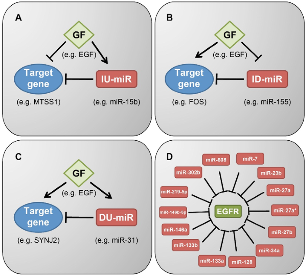 Network modules incorporating microRNAs and growth factor signaling pathways. (A) A feed-forward loop (FFL), whereby EGFR signaling down-regulates the expression of MTSS1, an inhibitor of metastasis. Inhibition of MTSS1 is strengthened by the induction of its targeting IU-miR, miR-15b; (B) A feed-forward loop whereby EGFR signaling up-regulates expression of the transcription factor FOS and, in parallel, down-regulates an ID-miR, miR-155, which inhibits FOS; (C) An incoherent FFL, whereby up-regulation of SYNJ2, a lipid phosphatase gene, by EGFR signaling is fine-tuned through the induction of the delayed up-regulated microRNA (DU-miR), miR-31, which inhibits SYNJ2 expression; (D) Listed are miRNAs that directly target EGFR in different cancer cells. (ID-miR, immediately down-regulated miRNA; IU-miR, immediately up-regulated miRNA; DU-miR, delayed up-regulated miRNA).