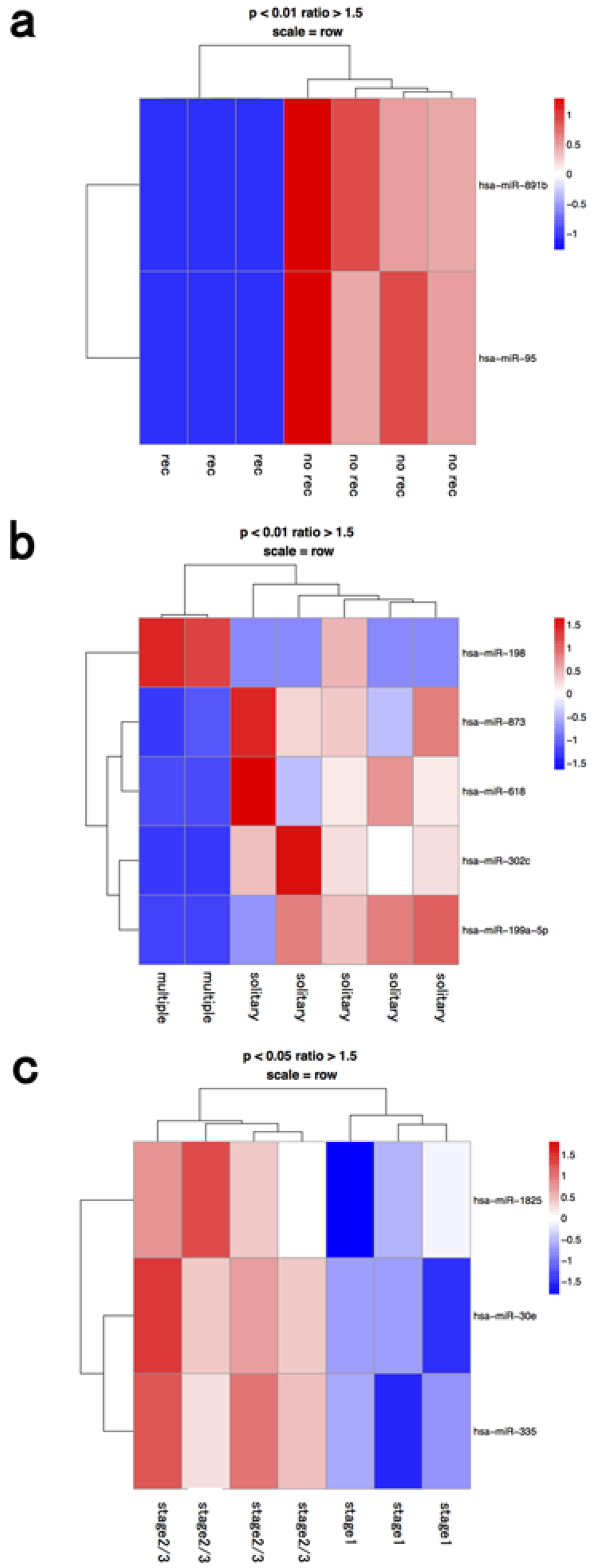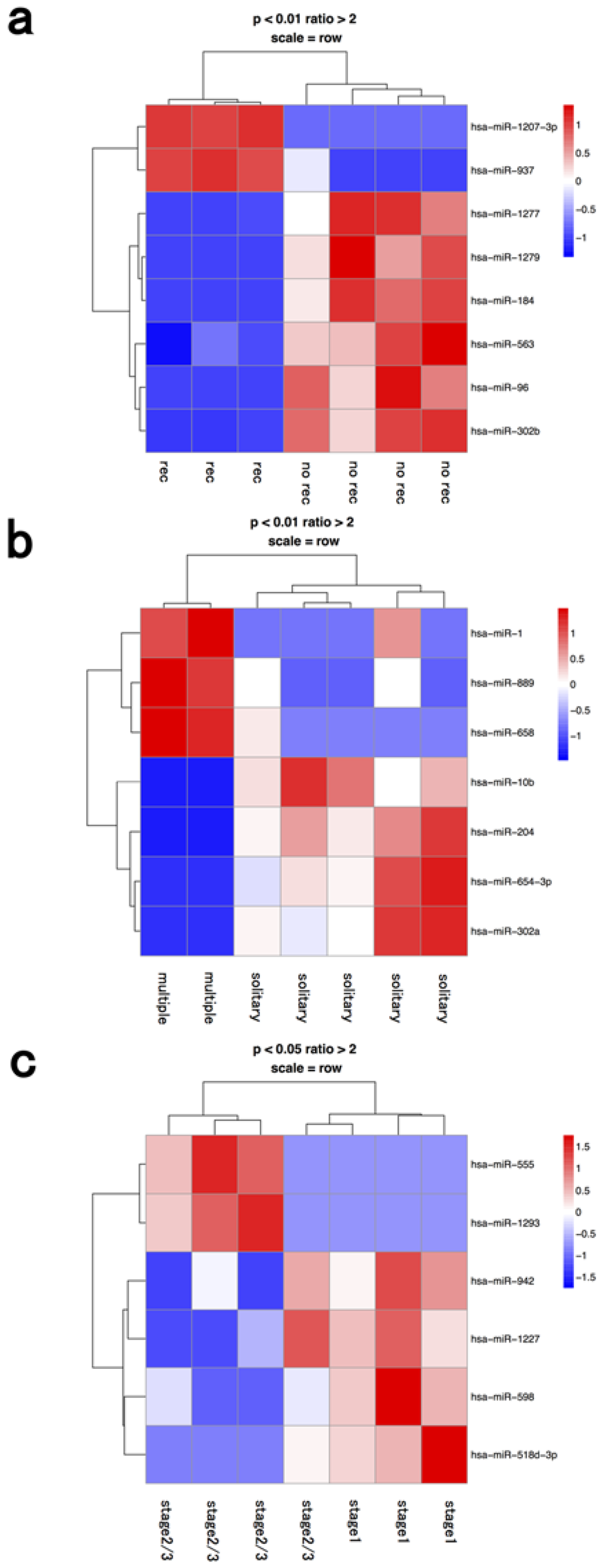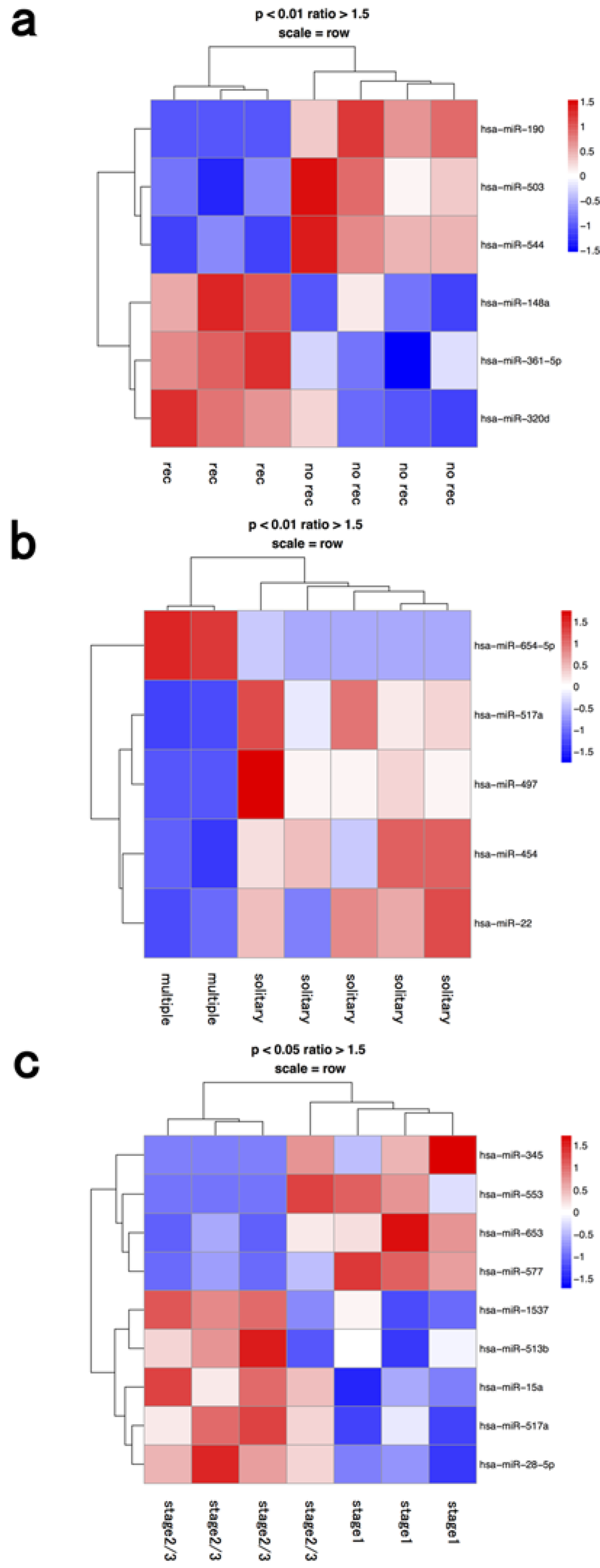 Hierarchical clustering analysis of microRNAs of whole bone marrow cells in seven patients with hepatocellular carcinoma. Heat map of the miRNA profile in bone marrow cells from hepatocellular carcinoma patients with (a) recurrence (n = 3) and no recurrence (n = 4); (b) solitary (n = 5) and multiple tumors (n = 2); (c) stage 1 (n = 3) and ≥stage 2 (n = 4). Cluster analysis showed two, five, and three miRNAs that were significantly differentially expressed between the two groups with a >1.50-fold change, respectively. Colors range from blue to red, corresponding to low to high expression, respectively. p values <0.01 or <0.05, unpaired t test. rec: recurrence.