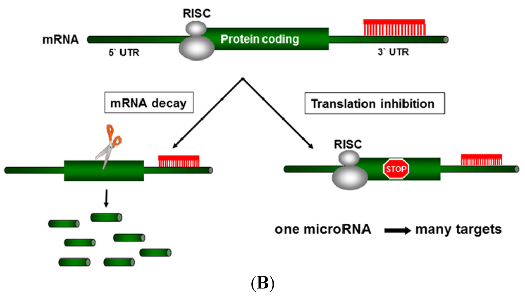 Biogenesis of microRNA (A) and transcriptional inhibition by microRNA (B). MicroRNA is transcribed from microRNA genes by RNA polymerase II into primordial-microRNAs. Segments of pri-miRNA contain a stem-loop structure that can be recognized by DiGeorge Syndrome Critical Region gene 8 (DGCR8) proteins for subsequent processing by RNase type III Drosha to produce pre-microRNAs. The hairpin-contained pre-microRNAs are then exported from the nucleus to the cytoplasm by a protein complex containing exportin-5 and RNA-GTP. In the cytoplasm, pre-microRNAs are further sliced by RNase type III Dicer, eliciting double-strand, ~22 nucleotide-long, mature microRNAs. After the duplex mature microRNA unwinds, degradation of the other strand follows. The single stranded mature microRNA within the RISC complex can subsequently act as a binding site to the messenger RNA (mRNA) targets. Perfect or nearly perfect complementarity to the 3′ UTR of mRNA results in cleavage of the mRNA targets. Partial complementarity of miRNA results in translational inhibition.
