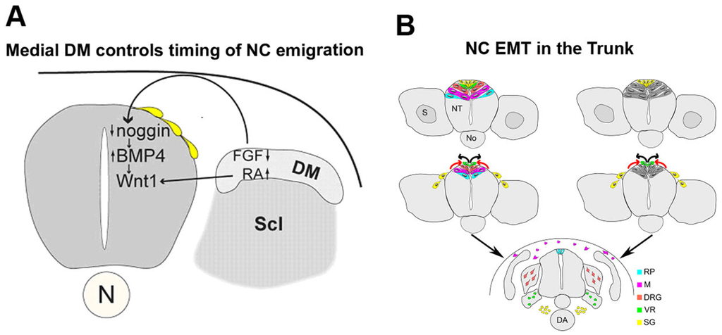 Epithelial to mesenchymal transition (EMT) of neural crest (NC) progenitors: Regulation and cellular dynamics. (A) The medial lip of the nascent dermomyotome (DM) controls the timing of NC delamination. In the early dorsal NT, prior to the onset of NC emigration, levels of Noggin are high thereby inhibiting the activity of BMP4 and NC delamination. The forming medial lip of the DM acts upon the dorsal NT via FGF8 and retinoic acid signaling to inhibit local noggin transcription thus relieving BMP4 which stimulates NC emigration. Scl, sclerotome; (B) Two possible models representing the dynamic dorsalward relocation of NC cells prior to emigration in association with fate restriction. In both models, the emigrating cells are largely fate-restricted. In the model on the left (spatial mechanism), a pattern reflecting the different fates is already apparent in the dorsal NT (color coding). In the model depicted on the right, fate restriction is assigned to a cell upon relocation to the dorsal midline area by a time-dependent mechanism. Abbreviations: DRG, dorsal root ganglia; M, melanocytes; RP, roof plate; SG, sympathetic ganglia; VR, Schwann cells along ventral root.