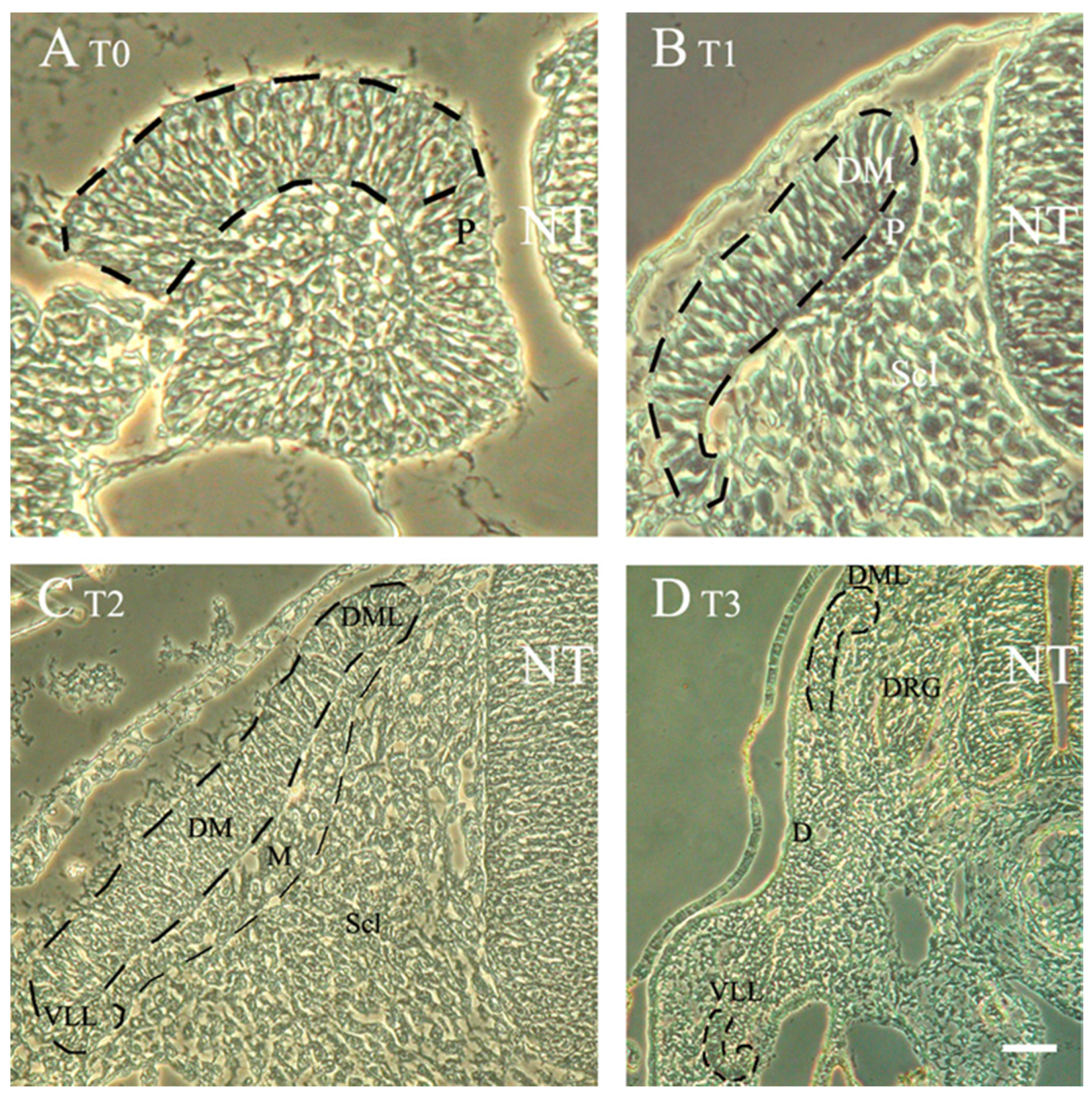 Successive stages in dermomyotome development at flank levels of the axis. Phase contrast images that illustrate: (A) T0, epithelial somite stage with the prospective dermomyotome (DM) highlighted by dashed lines; (B) T1, initial formation of the DM following mesenchymalization of the sclerotome (Scl). At this stage the pioneer (P) myoblasts bend underneath the nascent DM; (C) T2, the DM of a fully dissociated somite in which the primary myotome (M) is well differentiated. Note the well defined medial and lateral edges (DML and VLL, respectively); (D) T3, the DM dissociates into dermis except for the DML and VLL which still remain epithelial (demarcated by dashed lines). See text for precise stages. Abbreviations, DRG, dorsal root ganglion, NT, neural tube. Bar = (A) 8 μM; (B) 15 μM; (C) 22 μM; and (D) 80 μM.