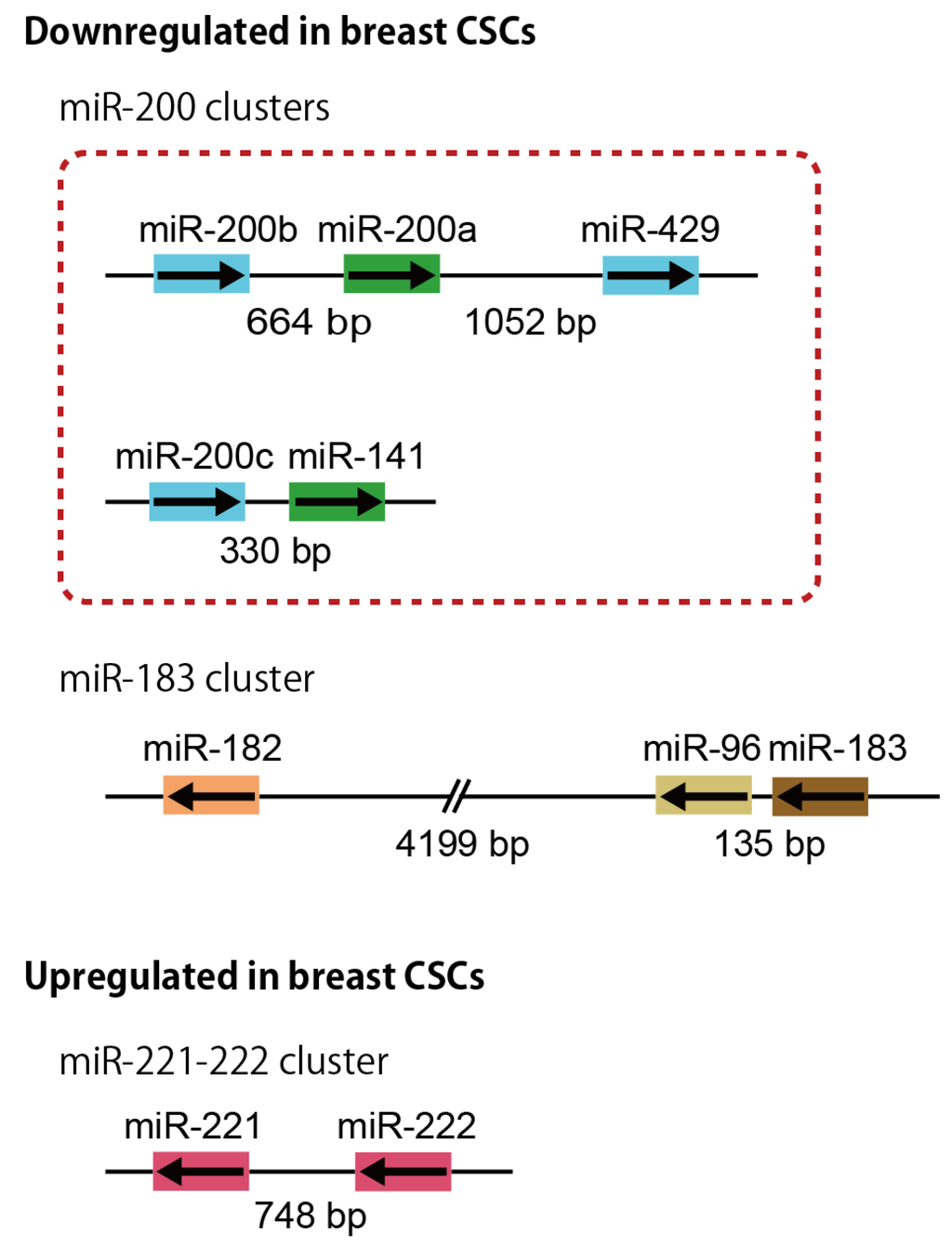 A schematic representation of the miRNA clusters dysregulated in human breast CSCs. The miRNAs sharing the same seed sequence (nucleotides from two to seven) are marked by the same color. The mammalian miR-200 clusters are expressed as two separate polycistronic pri-miRNA transcripts. The miRNAs coded in the miR-200b-200a-429, miR-200c-141 and miR-183-96-182 clusters are downregulated, and those in the miR-221-222 cluster are upregulated in the human breast CSCs. The arrows indicate the direction of the pri-miRNA transcription.