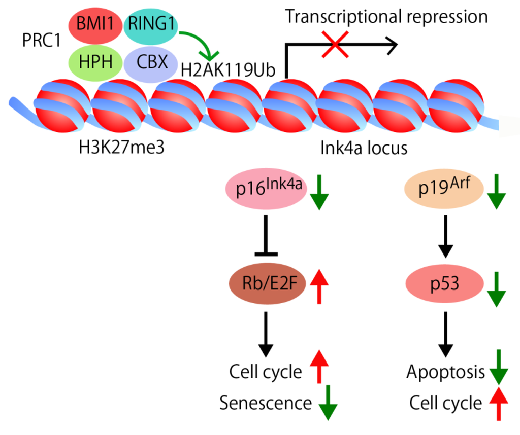 Regulation of cell cycle, apoptosis, and senescence by self-renewal factor Bmi1. Bmi1, a component of PRC1, is involved in the stem cell maintenance in multiple tissues and organs. PRC1 suppresses the Ink4a locus that encodes the p16Ink4a and the p19Arf genes through the specific biochemical histone modifications, such as the trimethylation of the H3-K27 (H3K27me3) and the ubiquitination of H2A-K119 (H2AK119Ub). The chromodomain of CBX binds to H3K27me3 and RING1 deposits monoubiquitin on H2AK119. In the absence of p16Ink4a, the cyclin D/Cdk4/6 complex can phosphorylate RB, allowing the E2F-dependent transcription which leads to cell cycle progression. In the absence of p19Arf, MDM2-mediated p53 degradation causes low p53 levels, thus preventing cell cycle arrest and apoptosis. In addition, the gradual accumulation of p16Ink4a expression during physiological aging implicates that p16Ink4a is involved in the regulation of senescence.