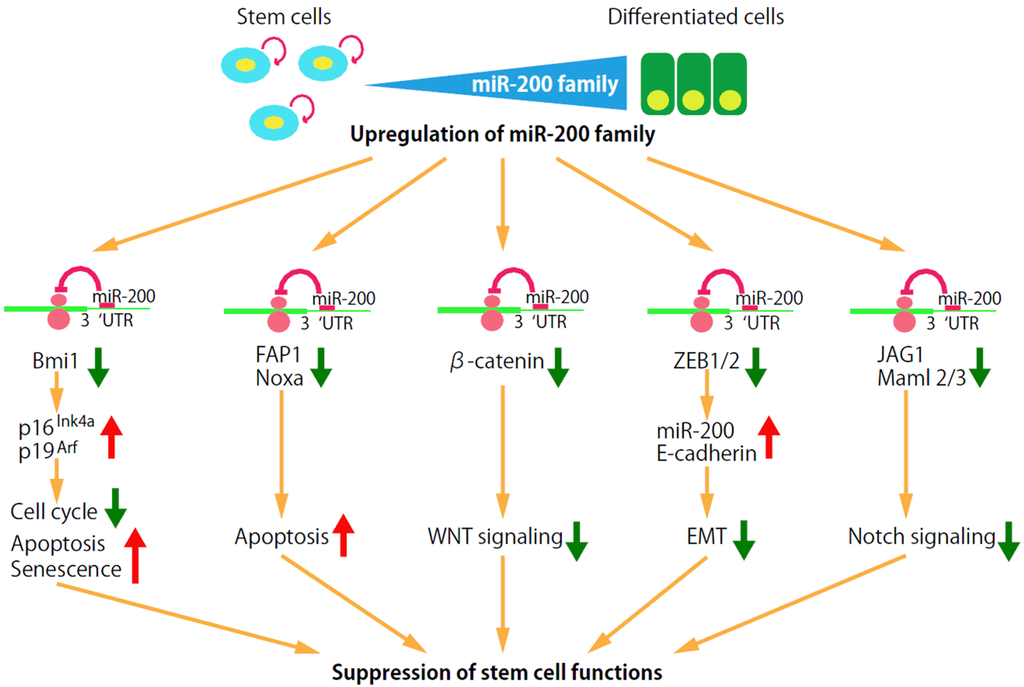 Targeting of the genes and pathways for stem cell maintenance by miR-200 family miRNAs. Expression of the miR-200 family miRNAs is downregulated in the breast CSCs and normal mammary stem/progenitor cells, and is upregulated in the more differentiated counterparts. The miR-200 family miRNAs are involved in the regulation stem cell functions by targeting the genes and pathways important for stem cell maintenance, such as self-renewal factor Bmi-1, the apoptosis signaling pathway, the canonical Wnt signaling pathway, EMT and the Notch signaling pathway.