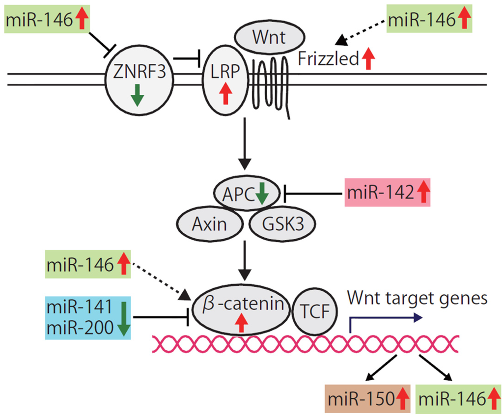 miRNAs target Wnt signaling components and dysregulate the activity of the canonical Wnt signaling. For example, miRNAs, such as miR-135, miR-27, mir-155, miR-129, miR-106b, let-7, miR-125, miR-663, and miR-142, target APC and activate canonical Wnt signaling [100,138,139,140,141,142,143,144,145,146]. miR-29 targets the negative regulators of Wnt signaling, such as Dikkopf-1 (Dkk1), Kremen2, and secreted frizzled related protein 2 (sFRP2) and activates the Wnt signaling pathway [147]. Furthermore, the Wnt signaling pathway is activated by the miRNAs that target other inhibitors of the Wnt signaling pathway [148].