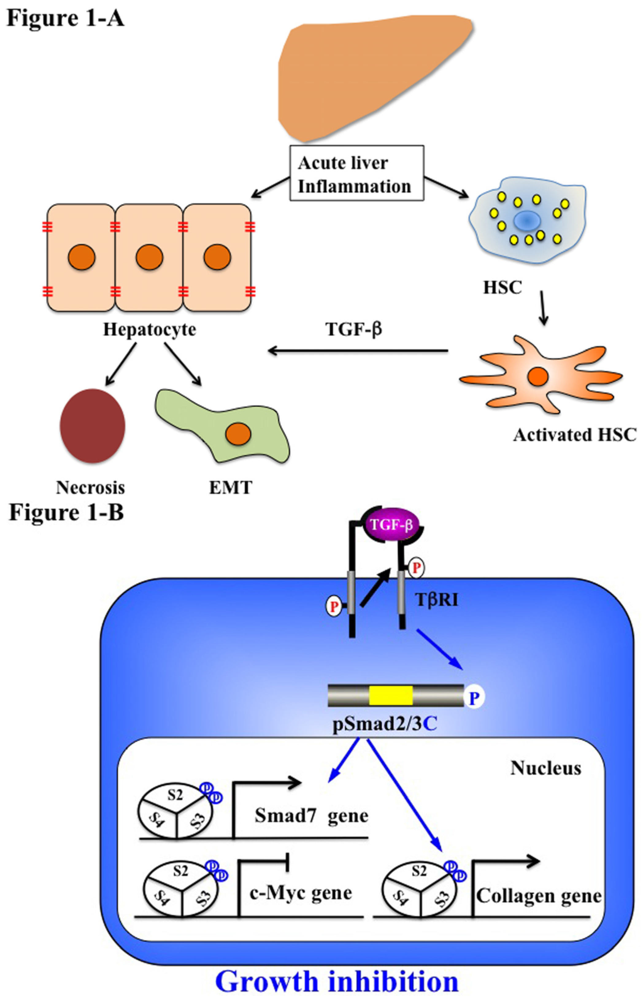 Liver regeneration-related EMT and phospho-Smad signaling in acute liver disease. (A) Quiescent hepatic stellate cells (HSC) are characterized by retinoid droplets in the cytoplasm. Acute liver injury caused HSC activation and hepatocyte damage, necrosis and EMT. Activated HSC move from the space of Disse to sites of damage where the activated HSC contribute to tissue repair by producing large amounts of collagen. HSC also play an important role in secreting TGF-β. (B) Catalytically-active TβRI phosphorylates COOH-tail serine residues of Smad2 and Smad3. Both pSmad2C and pSmad3C are localized in the nuclei of hepatocytes and mesenchymal cells in acute injured liver. After binding with Smad4, pSmad2/3C translocate with Smad4 to the nucleus and bind to the collagen promoter. pSmad2/3C stimulate extracellular matrix (ECM) deposition and suppress cell growth by c-Myc inhibition. However, Smad7 induced by the pSmad3L/C signal terminates the fibrogenic phospho-Smad signaling. This negative feedback mechanism of the fibrogenic TGF-β/CK signal results in a transient collagen synthesis in the activated HSC, which may thus contribute to tissue repair.