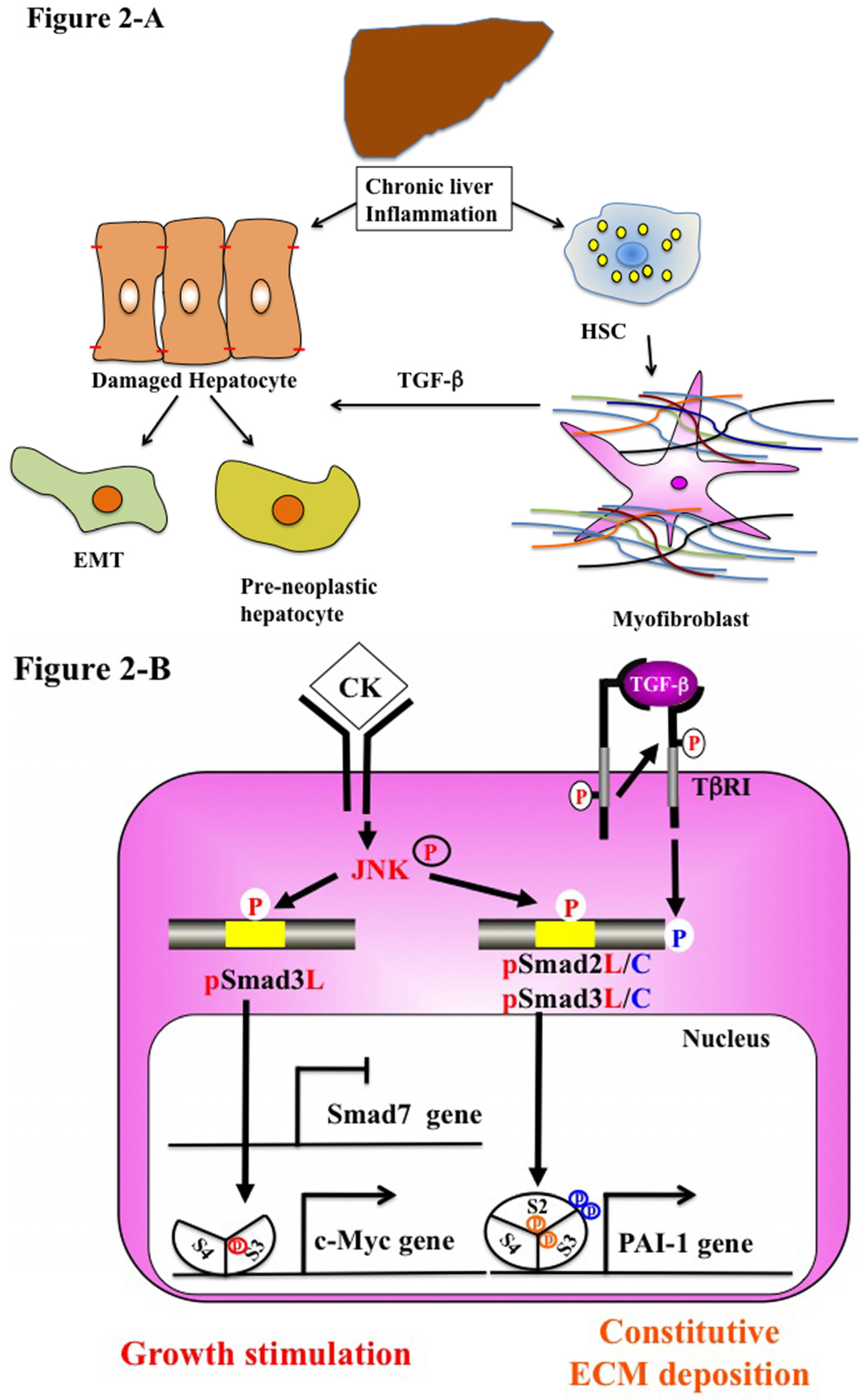 Liver fibro-carcinogenesis-related EMT and phospho-Smad signaling during chronic liver disease. (A) Prolonged exposure to chronic injury; HSC undergo constitutive activation to become myofibroblasts (MFB)-like cells, which persistently induce deposition of ECM and liver fibrosis. Continuous insults will shift EMT-like cells to complete EMT and pre-neoplastic hepatocytes. (B) During chronic liver injury, pro-inflammatory cytokines (CK), such as TNF-α activate JNK, result in phosphorylation of both Smad2L and Smad3L, both in MFB and pre-neoplastic hepatocyte. P-Smad3L translocates with Smad4 to the nucleus and binds the PAI-1 promoter. After COOH-tail phosphorylation of cytoplasmic pSmad2L by TβRI, pSmad2L/C translocates to the nucleus. Both pSmad2L/C and pSmad3L stimulates PAI-1 transcription and ECM deposition, while they suppress the pSmad3C-mediated tumor suppressive pathway. Pre-neoplastic hepatocytes exhibit the same oncogenic (mitogenic) pSmad3L and fibrogenic pSmad2L signaling as MFB, thereby accelerating liver fibrosis and increasing the risk of HCC. In contrast to Smad7 induction in HSC via the pSmad3C pathway, pSmad3L cannot induce Smad7 in MFB and pre-neoplastic hepatocytes (left). Under a low level of Smad7, the fibrogenic phospho-Smad signaling can constitutively promote ECM deposition by MFB, which may eventually develop into accelerated liver fibro-carcinogenesis.