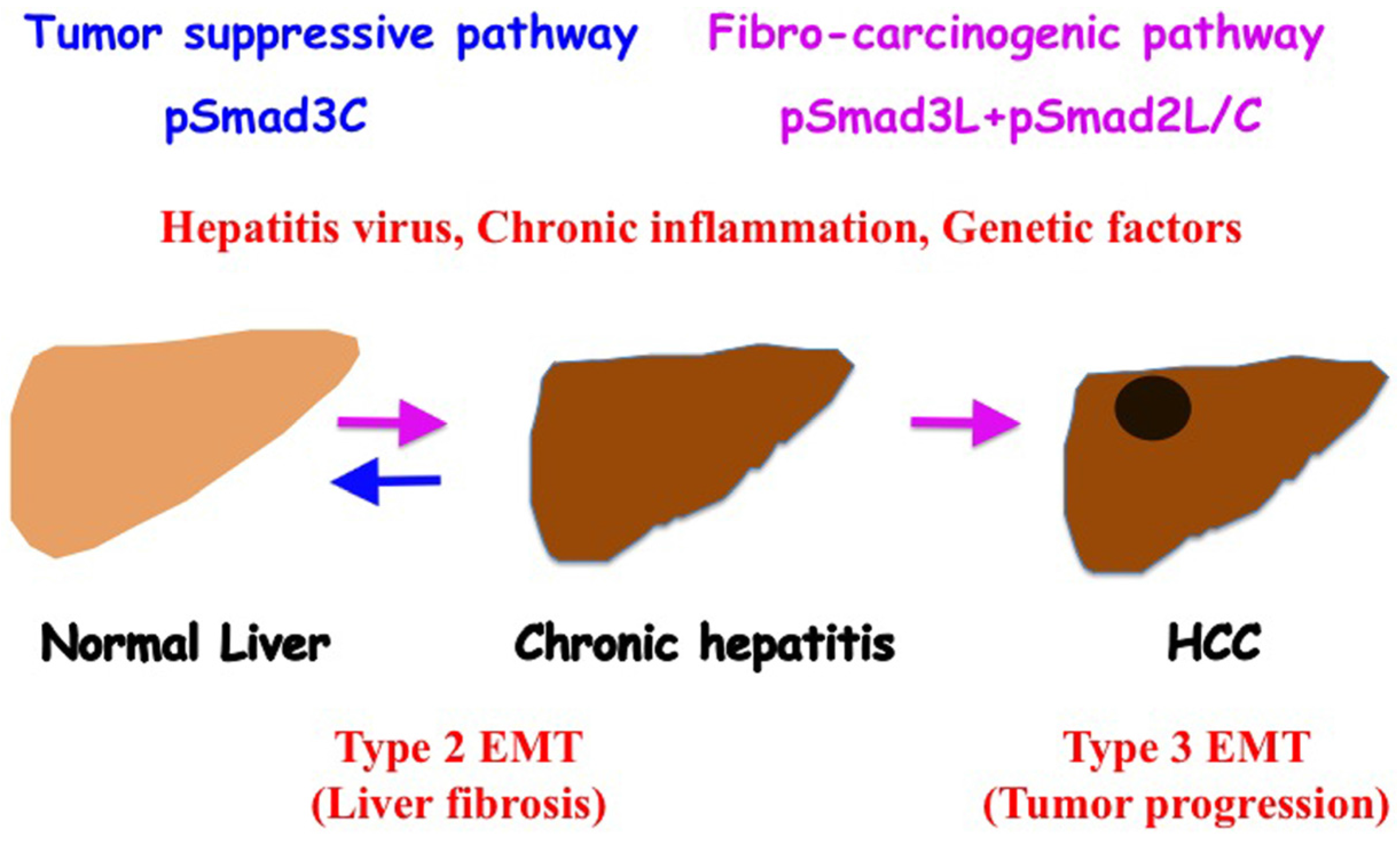 Phosphorylated Smad2/3 signaling fibro-carcinogenesis. As human hepatitis virus-related chronic liver diseases progress, chronic inflammation and hepatitis virus additively shift hepatocytic Smad phospho-isoform signaling from tumor-suppressive pSmad3C to the fibro-carcinogenic pSmad3L and pSmad2L/C pathway. Anti-viral therapy can reverse phospho-Smad signaling from fibro-carcinogenesis to tumor suppression. Type 2 EMT promotes liver fibrosis induced by chronic inflammation. Type 3 EMT exacerbates the HCC phenotype by upregulating invasive and metastatic potential.