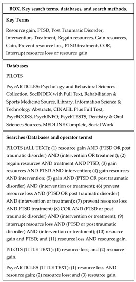 There are undoubtedly studies about interventions that promote resource gain that were not found in this literature review due to inherent limitation of electronic searching. For example, Trauma Management Therapy (TFT) for PTSD was developed for combat Veterans and showed that a combination of education, exposure, and social and emotional skills training decreased symptoms and increased participation in social and employment activities [42]. In another study primarily about the benefit of acupuncture for PTSD, the comparator intervention was a 12-week integrated CBT delivered in group [43]. Sessions 1 to 3 utilize psychoeducation, behavioral activation, and activity planning, collectively termed “Trajectory and Resource Loss Stabilization”. Participants identify valued resources that have either been lost or are at-risk, and then make plans to engage in activities that will help establish a resource gain cycle. During Sessions 4 to 12 where participants are taught classic cognitive restructuring [44], imagery rehearsal [45], and exposure and desensitization techniques [46,47], participants continue to establish a resource gain cycle. Simple effects analyses showed that symptoms on the Post-Traumatic Symptom Scale—Self-Report (PSS-SR) declined significantly from baseline to end-treatment, with 36% having PSS-SR scores below the entry criterion level of ≥16 at end-treatment.